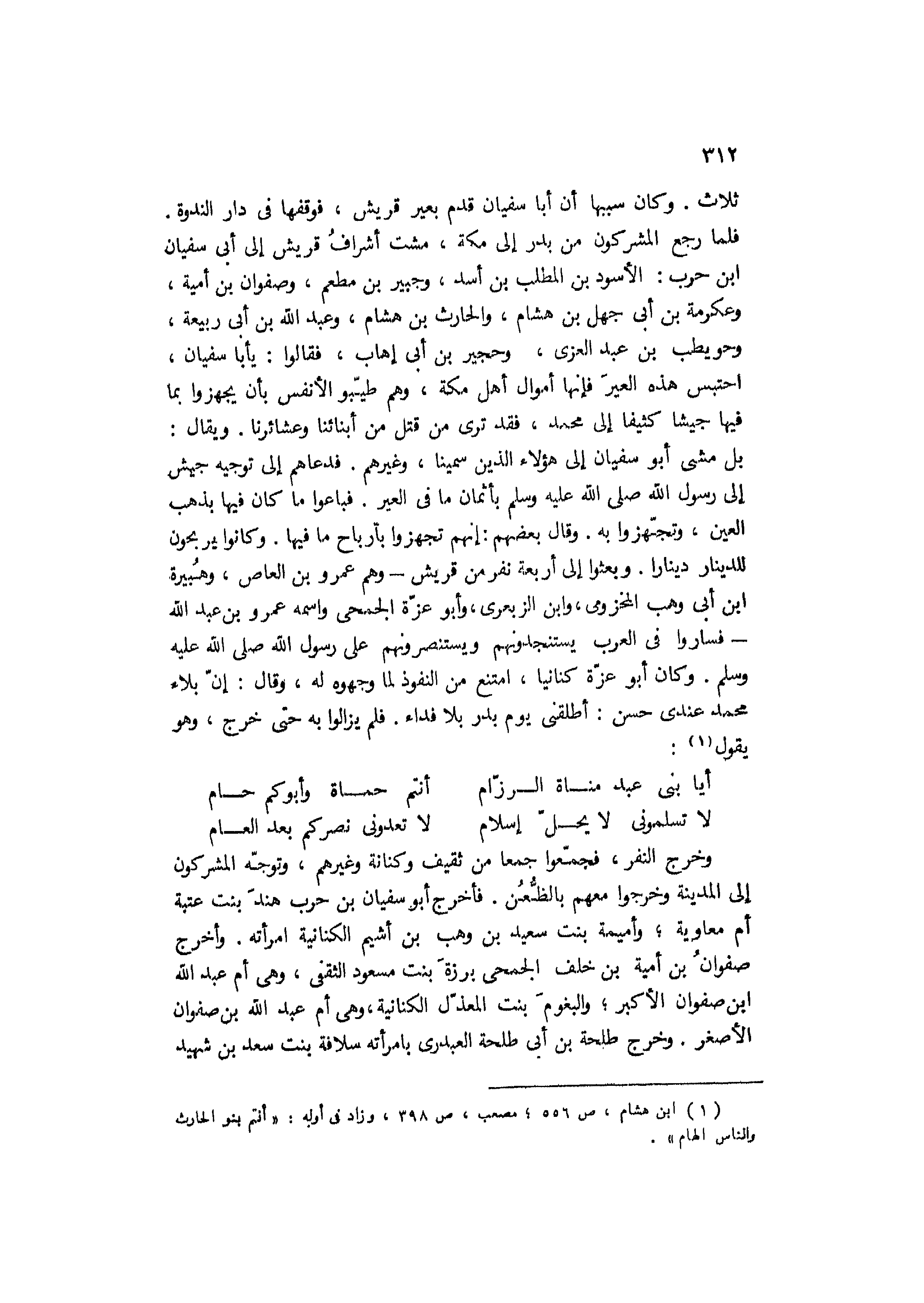 بل مشى أَبُو سُفْيَان إلى هَؤُلَاءِ الَّذِينَ سمينا، وغيرهم. فدعاهم إلى توجيه جيش إلى رَسُول اللَّه صَلَّى اللَّهُ عَلَيْهِ وَسَلَّمَ بأثمان ما في العير. فباعوا ما كَانَ فيها بذهب العين، وتجهزوا به. وقال بعضهم: إنهم تجهزوا بأرباح ما فيها. وكانوا يربحون للدينار دينارًا. وبعثوا إلى أربعة نفر من قريش- وهم عَمْرو بْن العاص، وهبيرة ابن أَبِي وهب المخزومي، وابن الزبعرى، وأبو عزَّة الجمحي واسمه عَمْرو بْن عَبْد اللَّه- فساروا فِي العرب يستنجدونهم ويستنصرونهم عَلَى رَسُول اللَّه صَلَّى اللَّهُ عَلَيْهِ وَسَلَّمَ. وكان أبو عزَّة كنانيًا، امتنع من النفوذ لما وجهوه لَهُ، وقَالَ: إنّ بلاء مُحَمَّد عندي حسن: أطلقني يَوْم بدر بلا فداء. فلم يزالوا بِهِ حتَّى خرج، وهو يَقُولُ [1] :
