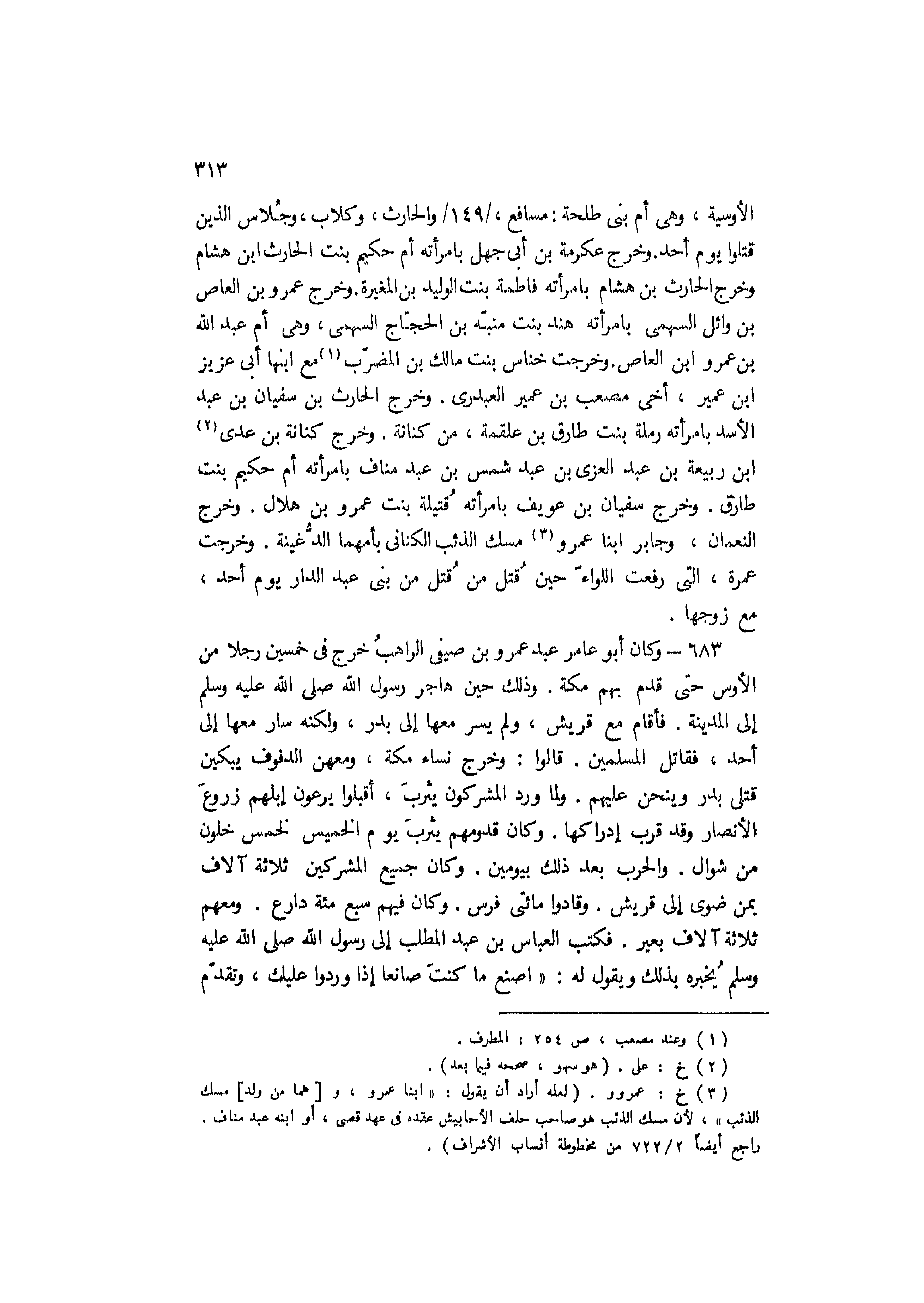 الأوسية، وهي أم بني طلحة: مسافع/ 149/ والحارث، وكلاب، وجُلاس الَّذِينَ قتلوا يَوْم أحد. وخرج عكرمة بْن أَبِي جهل بامرأته أم حكيم بنت الحارث ابن هشام وخرج الحارث بْن هشام بامرأته فاطمة بِنْت الوليد بْن المغيرة. وخرج عَمْرو بْن العاص بْن وائل السهمي بامرأته هند بِنْت منبّه بْن الحجاج السهمي، وهي أم عَبْد الله بن عمرو ابن العاص. وخرجت خناس بنت مالك بْن المضرب [1] مع ابنها أبى عزيز ابن عمير، أخي مصعب بْن عمير العبدري. وخرج الحارث بْن سُفْيَان بْن عَبْد الأسد بامرأته رملة بِنْت طارق بْن علقمة، من كنانة. وخرج كنانة بن عدى [2] ابن ربيعة بْن عَبْد العزى بْن عَبْد شمس بْن عَبْد مناف بامرأته أم حكيم بِنْت طارق. وخرج سُفْيَان بْن عويف بامرأته قُتيلة بِنْت عَمْرو بْن هلال. وخرج النعمان، وجابر ابنا عَمْرو [3] مسك الذئب الكناني بأمهما الدُّغينة. وخرجت عمرة، التي رفعت اللواء حين قُتل من قُتل من بني عَبْد الدار يَوْم أحد، مع زوجها.