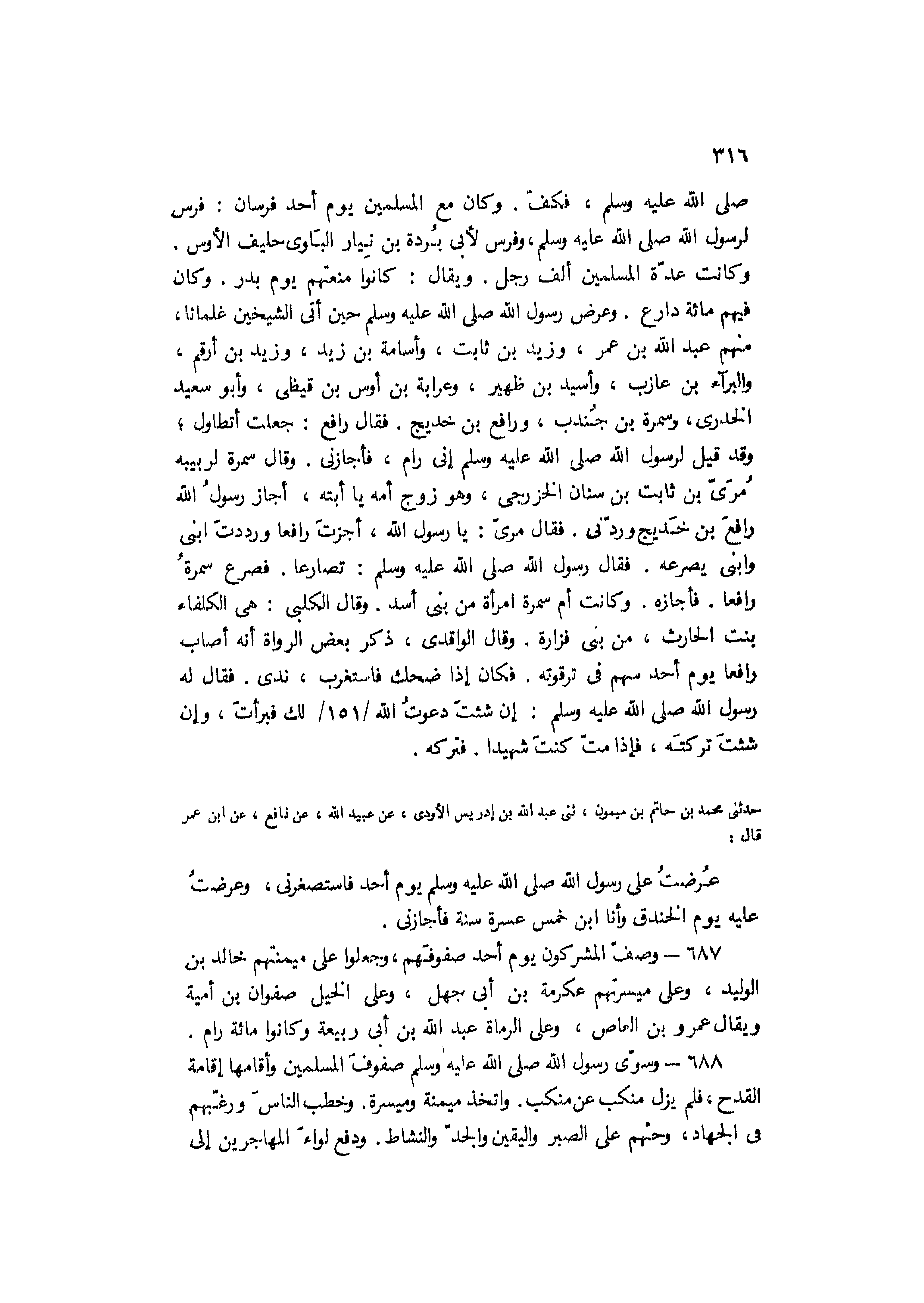 وكانت عدَّة المسلمين ألف رجل. ويقال: كانوا منعتهم يَوْم بدر. وكان فيهم مائة دارع. وعرض رَسُولُ اللَّهِ صَلَّى اللَّهُ عَلَيْهِ وَسَلَّمَ حِينَ أتى الشيخين غلمانا، منهم عَبْد اللَّه بْن عُمَر، وزيد بْن ثابت، وأسامة بْن زَيْد، وزيد بْن أرقم، والبراء بْن عازب، وأسيد بْن ظهير، وعرابة بْن أوس بْن قيظي، وأبو سَعِيد الخدري، وسمرة بْن جُندب، ورافع بْن خديج. فَقَالَ رافع: جعلت أتطاول، وَقَدْ قِيلَ لِرَسُولِ اللَّه صَلَّى اللَّهُ عَلَيْهِ وَسَلَّمَ إني رام، فأجازني. وقَالَ سمرة لربيبه مُرَيّ بْن ثابت بْن سنان الخزرجي، وهو زوج أمه يا أبته، أجاز رَسُولُ اللَّه رافعَ بْن خَديج وردني. فَقَالَ مُرَيّ: يا رَسُول اللَّه، أجزتَ رافعًا ورددت ابني وابني يصرعه. فَقَالَ رَسُول اللَّه صَلَّى اللَّهُ عَلَيْهِ وَسَلَّمَ: تصارعًا. فصرع سمرةُ رافعًا. فأجازه. وكانت أم سمرة امْرَأَة من بني أسد. وقَالَ الكلبي: هِيَ الكلفاء بِنْت الحارث، من بني فزارة. وقَالَ الواقدي، ذكر بعض الرواة أَنَّهُ أصاب رافعًا يَوْم أحد سهم فِي ترقوته. فكان إِذَا ضحك فاستغرب، ندى. [فَقَالَ لَهُ رَسُول اللَّه صَلَّى اللَّهُ عَلَيْهِ وَسَلَّمَ: إن شئت دعوتُ اللَّه/ 151/ لَكَ فبرأتَ، وإن شئت تركتَه، فإذا متّ كنتَ شهيدًا. فتركه] .