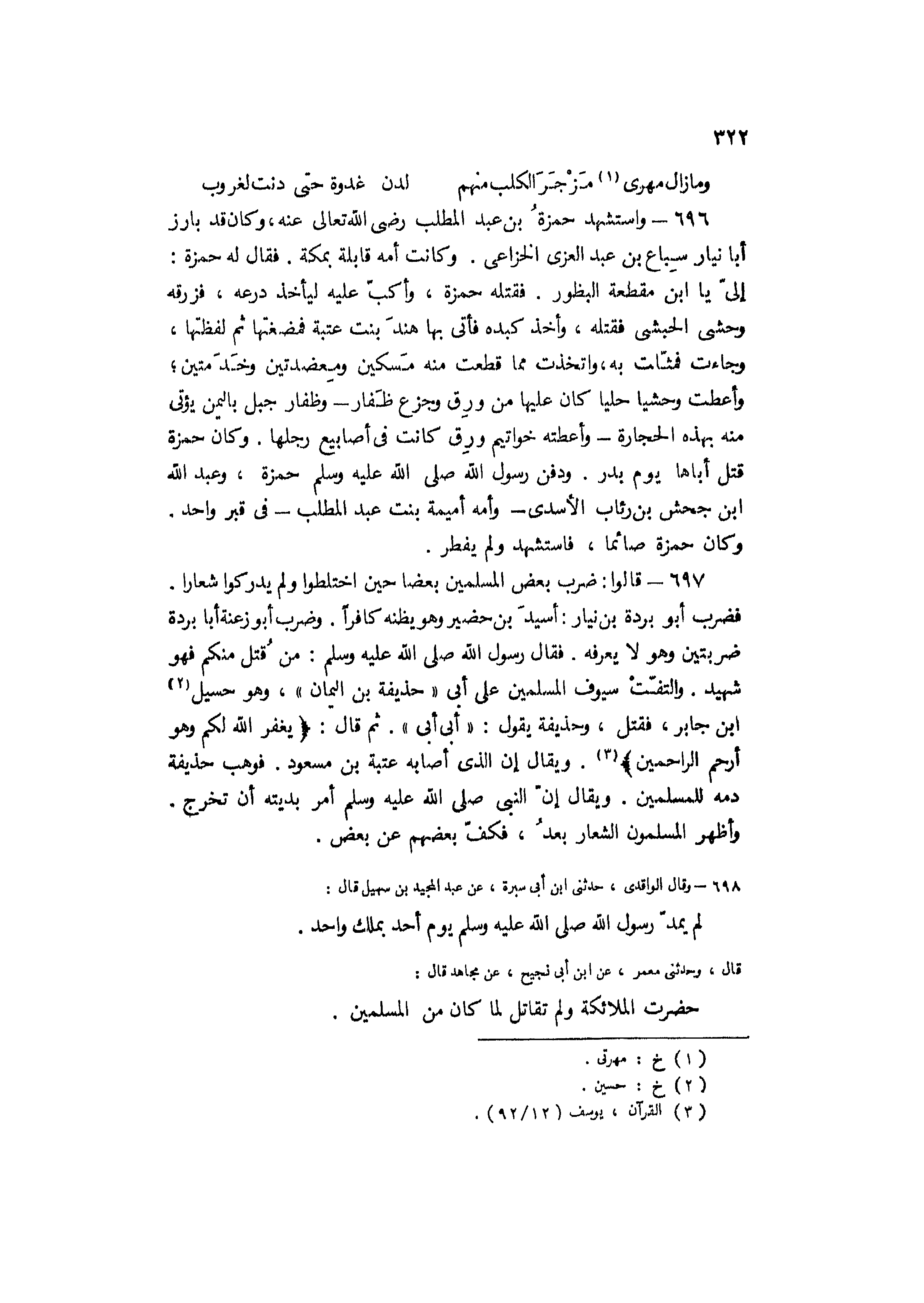 696- واستشهد حمزةُ بْن عَبْد المطلب رَضِي اللَّه تَعَالى عَنْهُ، وكان قَدْ بارز أبا نيار سِباع بْن عَبْد العزى الْخُزَاعِيُّ. وَكَانَتْ أُمُّهُ قَابِلَةً بِمَكَّةَ. فَقَالَ لَهُ حمزة: