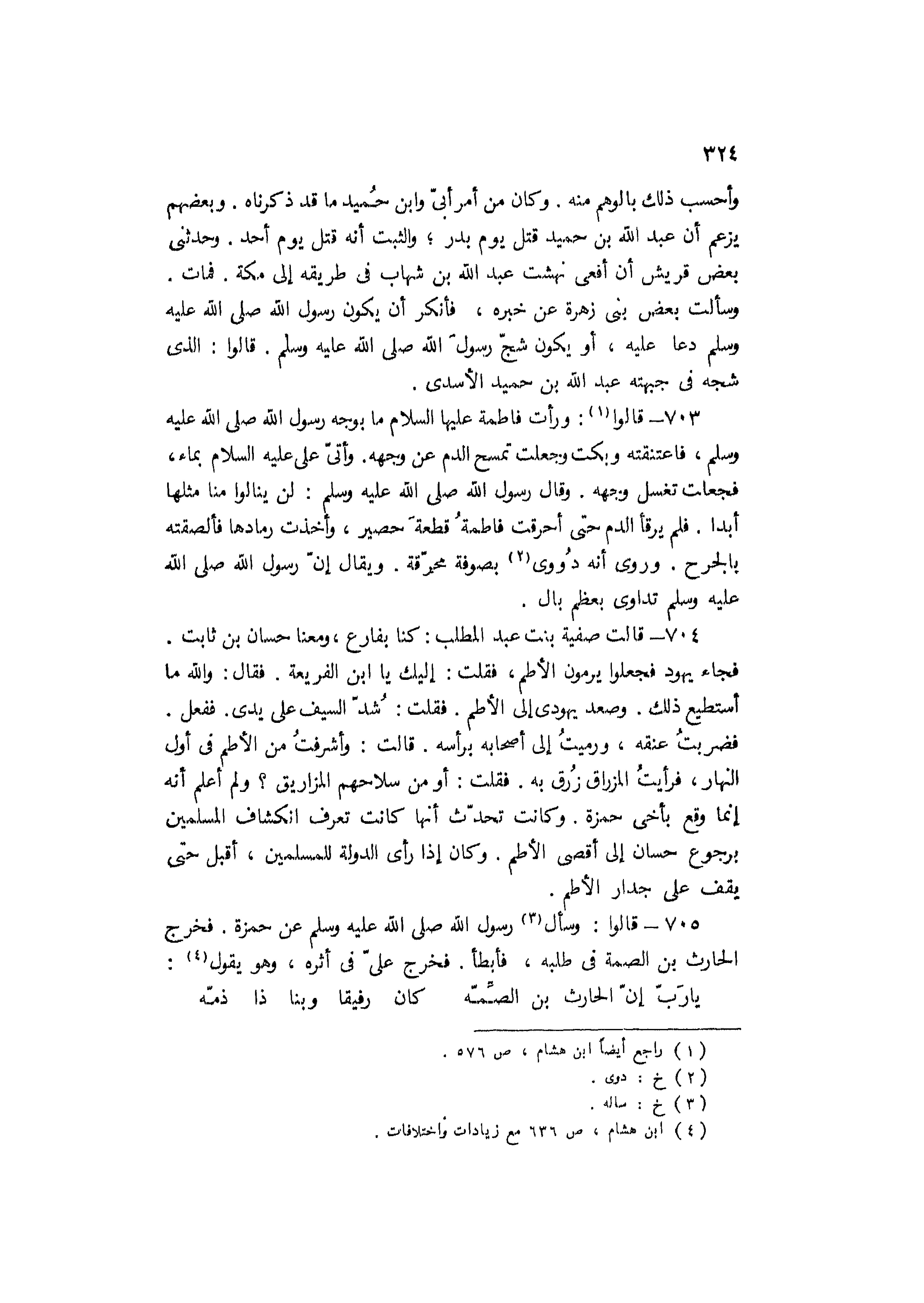 705- قَالُوا: وسأل [3] رَسُول اللَّه صَلَّى اللَّهُ عَلَيْهِ وَسَلَّمَ عَنْ حمزة. فخرج الحارث بْن الصمة فِي طلبه، فأبطأ. فخرج عليّ فِي أثره، وهو يَقُولُ [4] :