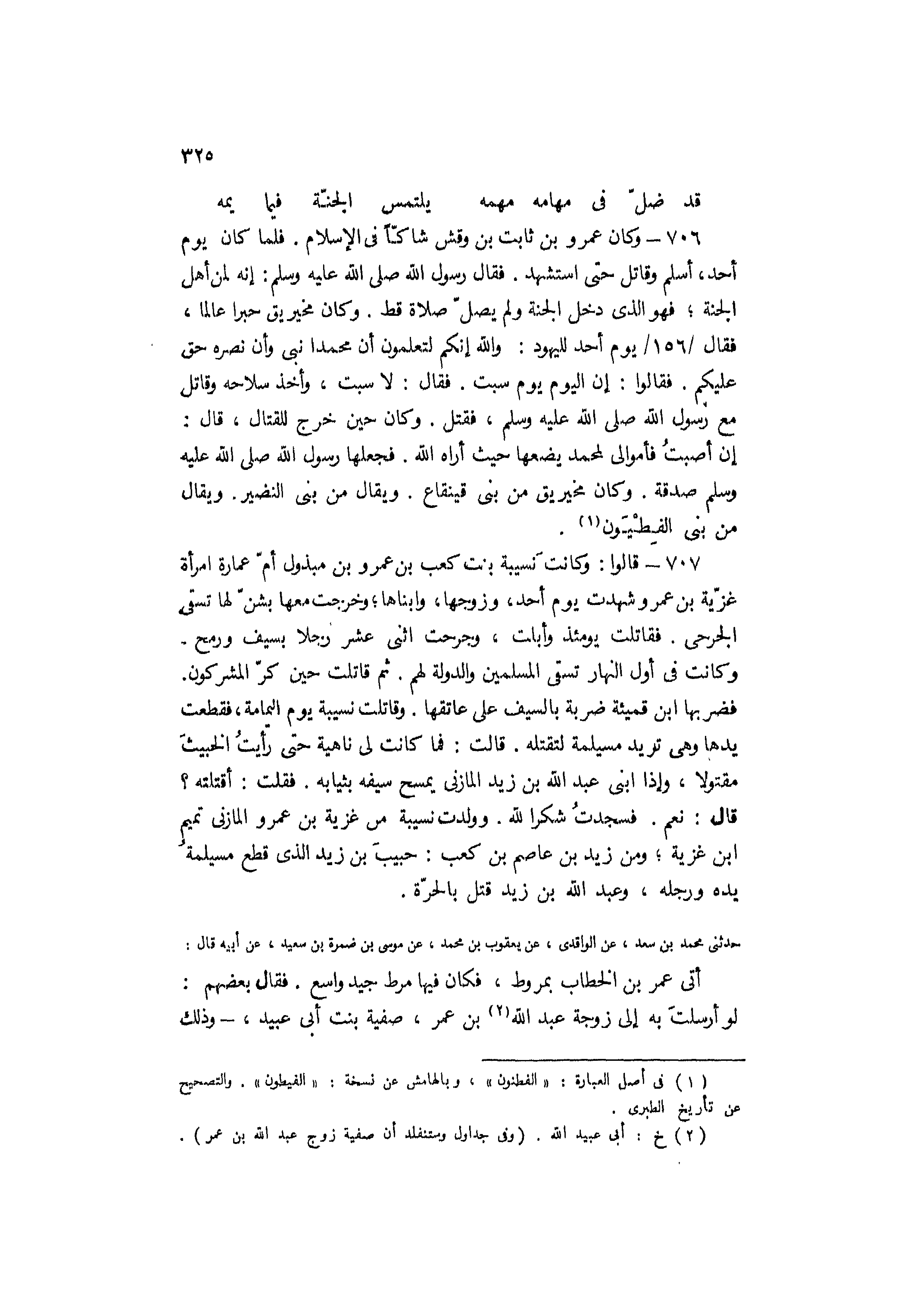 707- قَالُوا: وكانت نُسيبة بِنْت كعب بْن عَمْرو بْن مبذول أمّ عمارة امْرَأَة غزّية بْن عمرو شهدت يَوْم أحد، وزوجها، وابناها، وخرجت معها بشنّ لها تسقي الجرحى. فقاتلت يومئذ وأبلت، وجرحت أثني عشر رجلًا بسيف ورمح.