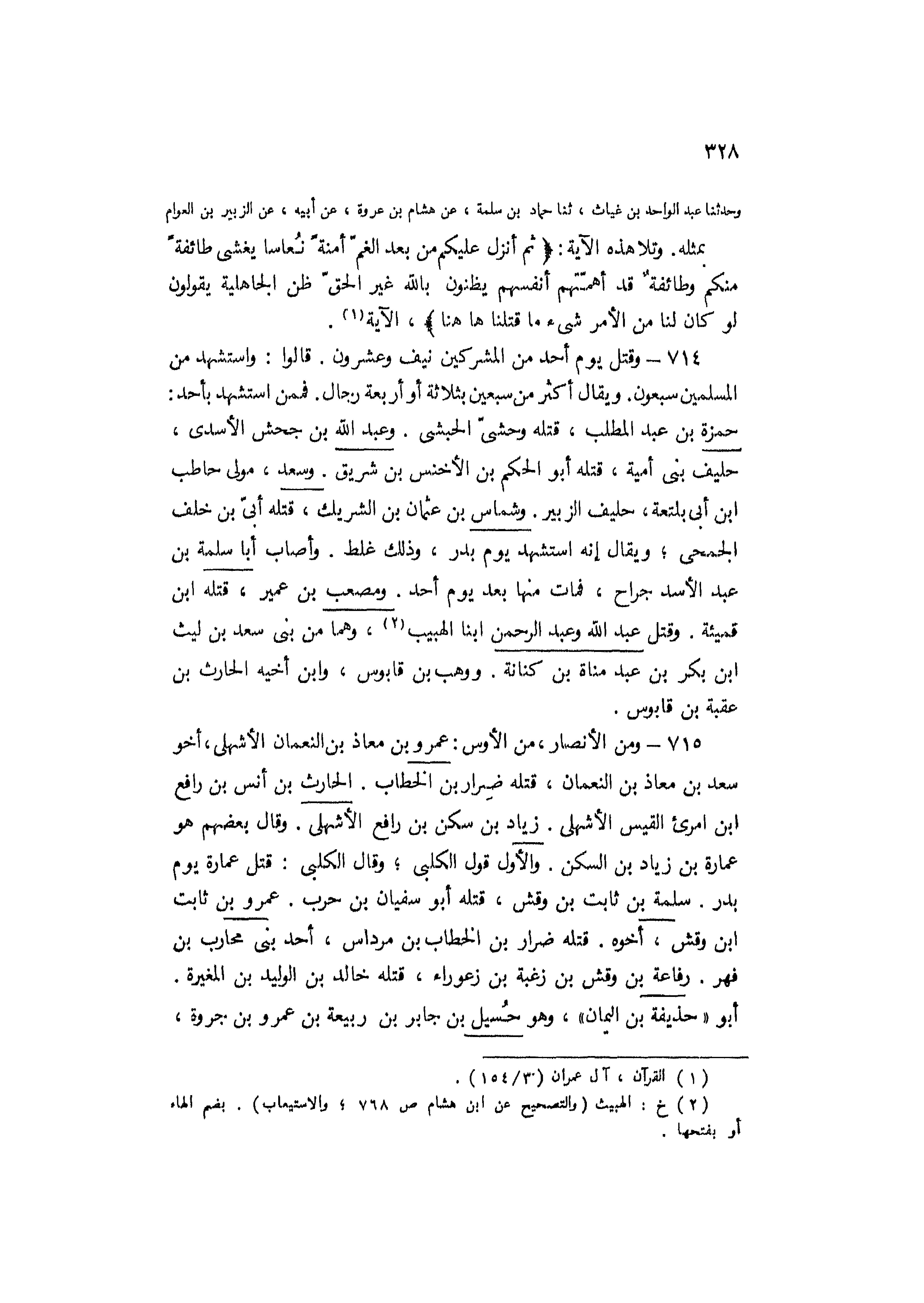 وحدثنا عَبْدُ الْوَاحِدِ بْنُ غِيَاثٍ، ثنا حَمَّادُ بْنُ سَلَمَةَ، عَنْ هِشَامِ بْنِ عُرْوَةَ، عَنْ أَبِيهِ، عَنِ الزُّبَيْرِ بْنِ الْعَوَّامِ بِمِثْلِهِ. وَتَلا هَذِهِ الآيَةَ: ثُمَّ أَنْزَلَ عَلَيْكُمْ مِنْ بَعْدِ الْغَمِّ أَمَنَةً نُعاساً يَغْشى طائِفَةً مِنْكُمْ وَطائِفَةٌ قَدْ أَهَمَّتْهُمْ أَنْفُسُهُمْ يَظُنُّونَ بِاللَّهِ غَيْرَ الْحَقِّ ظَنَّ الْجاهِلِيَّةِ يَقُولُونَ لَوْ كانَ لَنا مِنَ الْأَمْرِ شَيْءٌ ما قُتِلْنا هاهُنا، الآية [1] .