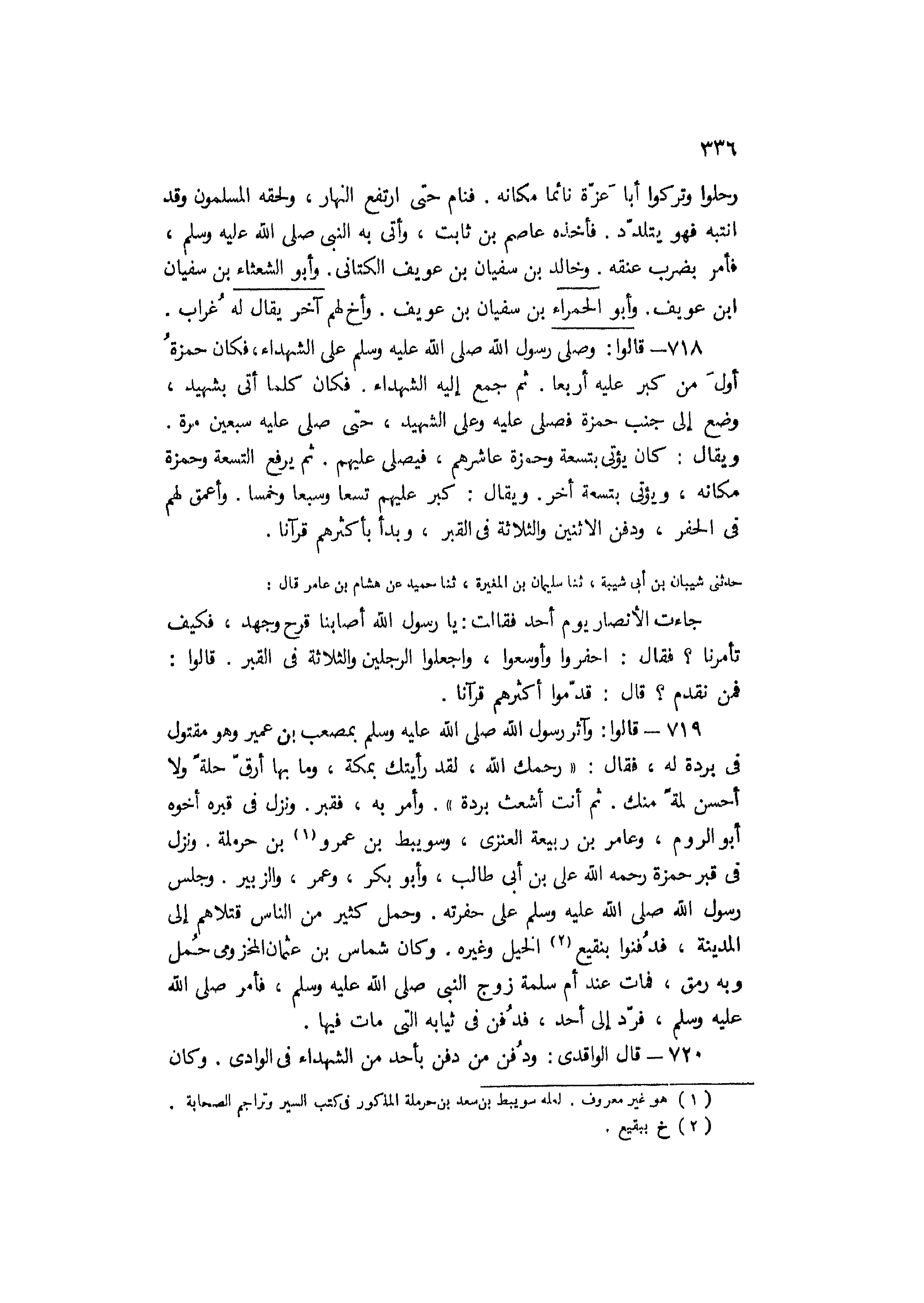 719- قَالُوا: وآثر رَسُول اللَّه صَلَّى اللَّهُ عَلَيْهِ وَسَلَّمَ بمصعب بْن عمير وهو مقتول فِي بردة لَهُ، فَقَالَ: « [رحمك اللَّه، لقد رأيتك بمكة، وَمَا بِهَا أَرَقُّ حُلَّةً وَلا أَحْسَنُ لِمَّةً منك. ثُمَّ أنت أشعث بردة] » . وأمر بِهِ، فقبر. ونزل فِي قبره أخوه أَبُو الروم، وعامر بْن ربيعة العنزي، وسويبط بْن عَمْرو [1] بْن حرملة. ونزل فِي قبر حمزة رحمة اللَّه عليّ بْن أَبِي طَالِب، وأبو بَكْر، وعمر، والزبير. وجلس رَسُولُ اللَّهِ صَلَّى اللَّهُ عَلَيْهِ وَسَلَّمَ عَلَى حفرته. وحمل كَثِير من النَّاس قتلاهم إلى المدينة، فدُفنوا بنقيع [2] الخيل وغيره. وكان شماس بْن عثمان المخزومي حُمل وبه رمق، فمات عند أم سَلَمة زوج النَّبِيّ صَلَّى اللَّهُ عَلَيْهِ وَسَلَّمَ، فأمر صَلَّى اللَّهُ عَلَيْهِ وَسَلَّمَ، فرّد إلى أحد، فدُفن فِي ثيابه التي مات فيها.