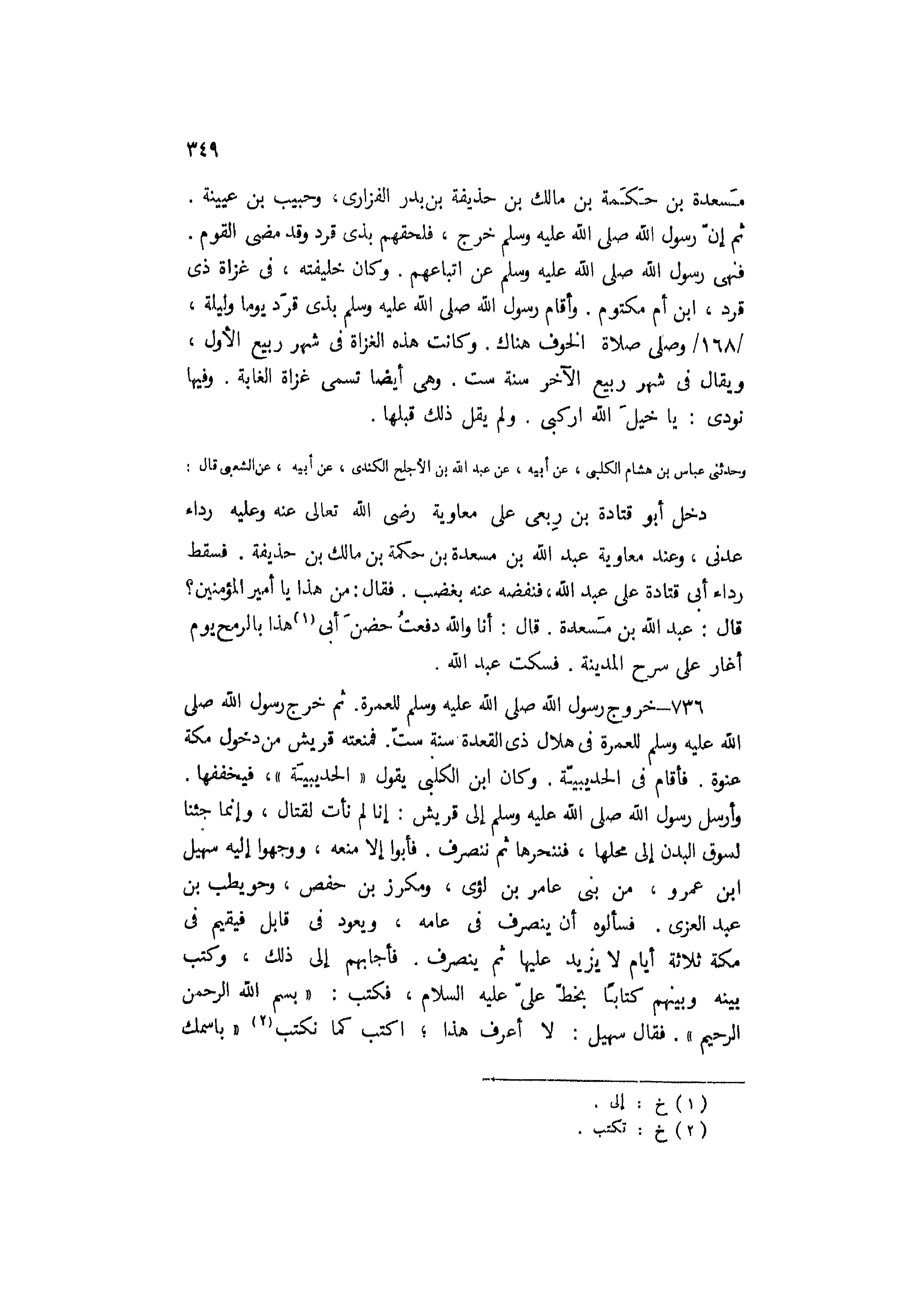 وأرسل رَسُول اللَّه صَلَّى اللَّهُ عَلَيْهِ وَسَلَّمَ إلى قريش: [إنا لم نأت لقتال، وإنما جئنا لسوق البدن إلى محلها، فننحرها ثُمَّ ننصرف.] فأبوا إلا منعه، ووجهوا إليه سهيل ابن عَمْرو، من بني عامر بْن لؤي، ومكرز بْن حَفْص، وحويطب بْن عَبْد العزى. فسألوه أن ينصرف فِي عامه، ويعود فِي قابل فيقيم فِي مكَّة ثلاثة أيام لا يزيد عليها ثُمَّ ينصرف. فأجابهم إلى ذَلِكَ، وكتب بينه وبينهم كتابًا بخطّ عليّ عَلَيْهِ السَّلام، فكتب: «بسم اللَّه الرَّحْمَن الرَّحِيم» . فَقَالَ سهيل: لا أعرف هَذَا، اكتب كما نكتب [2] «باسمك
