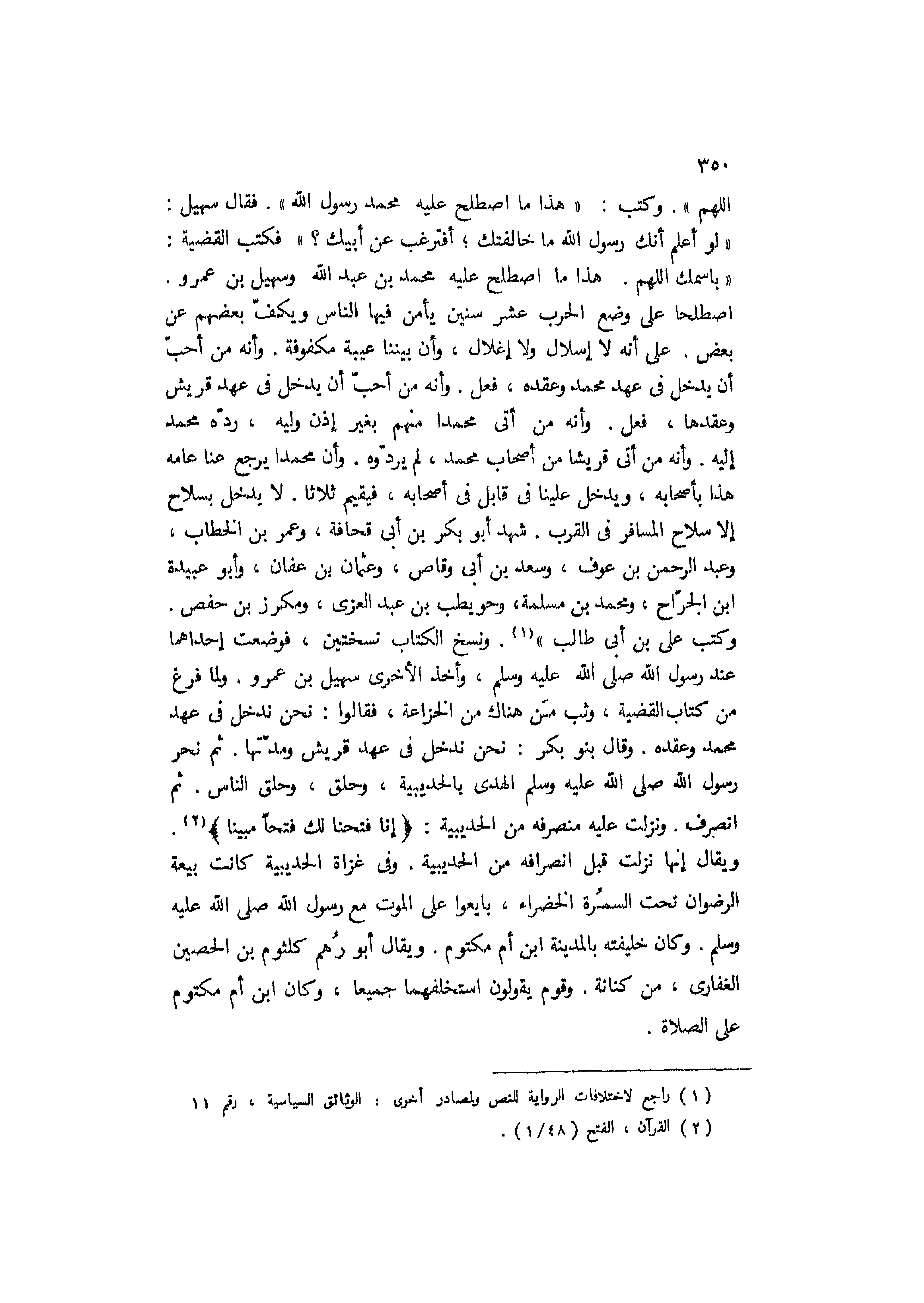 [1] راجع لاختلافات الرواية للنص ولمصادر أخرى: الوثائق السياسية، رقم 11