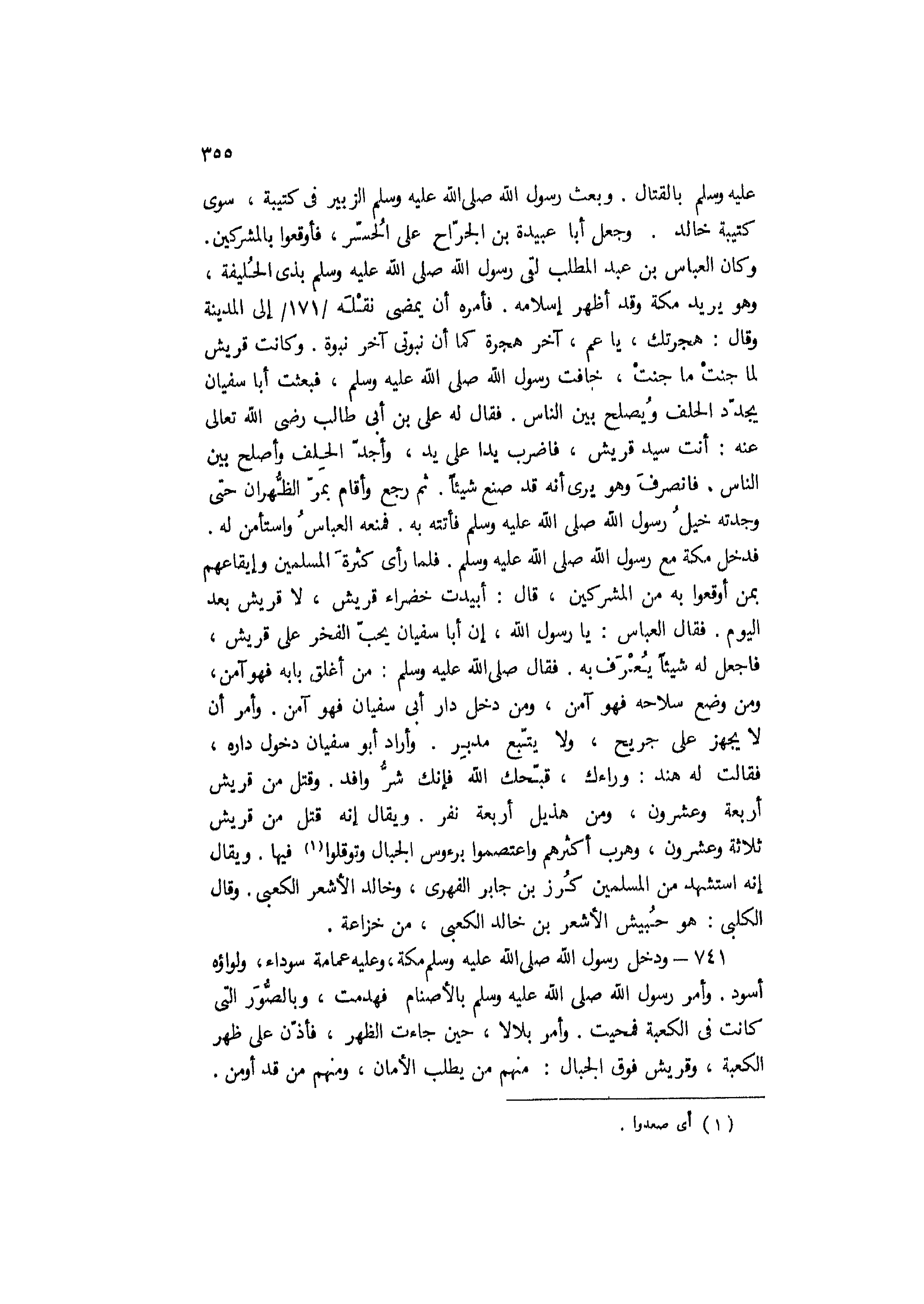 741- ودخل رَسُول اللَّه صَلَّى اللَّهُ عَلَيْهِ وَسَلَّمَ مكَّة، وعليه عمامة سوداء، ولواؤه أسود. وأمر رسول الله صلى الله عليه وسلم بالأصنام فهدمت، وبالصُّوَر التي كانت فِي الكعبة فمحيت. وأمر بلالًا، حين جاءت الظهر، فأذّن عَلَى ظهر الكعبة، وقريش فوق الجبال: منهم من يطلب الأمان، ومنهم من قَدْ أومن.