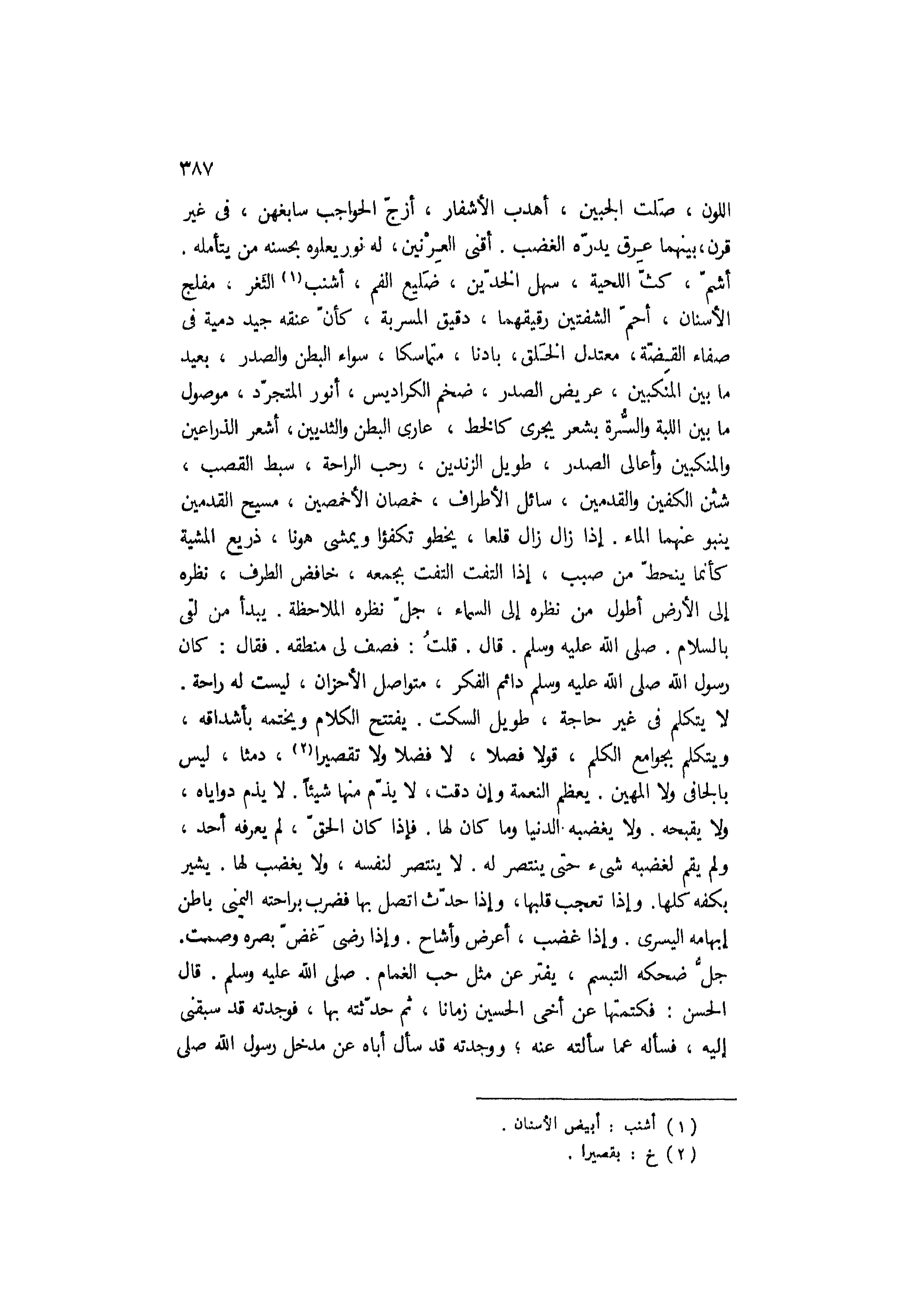أَشَمَّ، كَثَّ اللِّحْيَةِ، سَهْلَ الْخَدَّيْنِ، ضَلِيعَ الْفَمِ، أَشْنَبَ [1] الثَّغْرِ، مُفْلَجَ الأَسْنَانِ، أَحَمَّ الشَّفَتَيْنِ رَقِيقَهُمَا، دَقِيقَ الْمَسْرَبَةِ، كَأَنَّ عُنُقَهُ جِيدُ دمية في صفاء القضّة، مُعْتَدِلَ الْخَلْقِ، بَادِنًا، مُتَمَاسِكًا، سَوَاءَ الْبَطْنِ وَالصَّدْرِ، بَعِيدَ مَا بَيْنَ الْمَنْكِبَيْنِ، عَرِيضَ الصَّدْرِ، ضَخْمَ الْكَرَادِيسِ، أَنْوَرَ الْمُتَجَرِّدِ، مَوْصُولَ مَا بَيْنَ اللَّبَّةِ وَالسُّرَّةِ بِشَعْرٍ يَجْرِي كَالْخَطِّ، عَارِيَ الْبَطْنِ وَالثَّدْيَيْنِ، أَشْعَرَ الذِّرَاعَيْنِ وَالْمَنْكِبَيْنِ وَأَعَالِي الصَّدْرِ، طَوِيلَ الزَّنْدَيْنِ، رَحْبَ الرَّاحَةِ، سَبْطَ الْقَصَبِ، شَثْنَ الْكَفَّيْنِ وَالْقَدَمَيْنِ، سَائِلَ الأَطْرَافِ، خَمْصَانَ الأَخْمَصَيْنِ، مَسِيحَ الْقَدَمَيْنِ يَنْبُو عَنْهُمَا الْمَاءُ. إِذَا زَالَ زَالَ قَلْعًا، يَخْطُو تكفؤا وَيَمْشِي هَوْنًا، ذَرِيعَ الْمِشْيَةِ كَأَنَّمَا يَنْحَطُّ مِنْ صبب، إذا التفت الْتَفَتَ بِجُمَعِهِ، خَافِضَ الطَّرْفِ، نَظَرُهُ إِلَى الأَرْضِ أَطْوَلُ مِنْ نَظَرِهِ إِلَى السَّمَاءِ، جُلُّ نَظَرِهِ الْمُلاحَظَةُ. يَبْدَأُ مَنْ لَقِيَ بِالسَّلامِ. صَلَّى اللَّهُ عَلَيْهِ وَسَلَّمَ. قَالَ. قُلْتُ: فَصِفْ لِي مَنْطِقُهُ. فَقَالَ: كَانَ رَسُولُ اللَّهِ صَلَّى اللَّهُ عَلَيْهِ وَسَلَّمَ دَائِمَ الْفِكْرِ، مُتَوَاصِلَ الأَحْزَانِ، لَيْسَتْ لَهُ رَاحَةٌ.