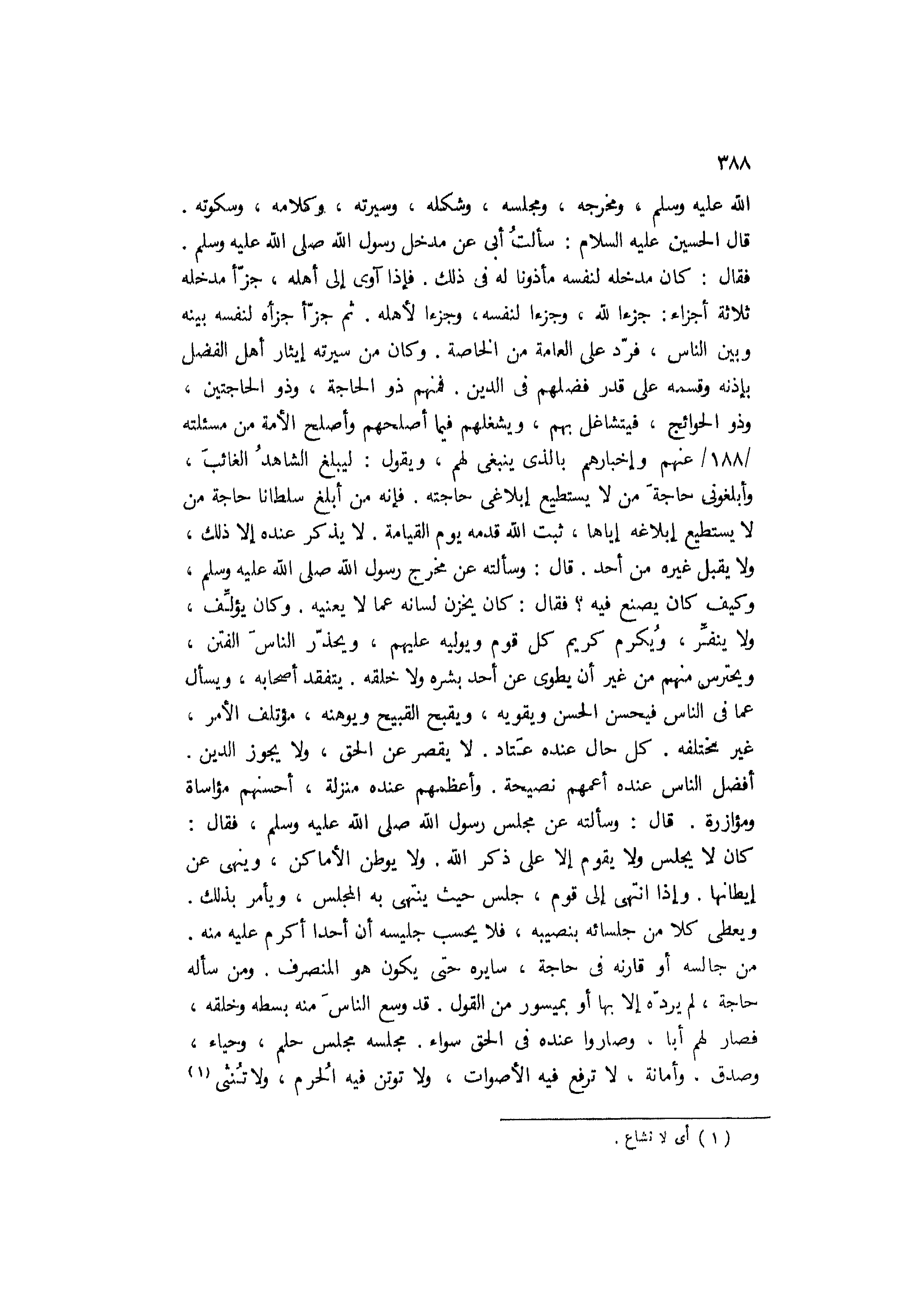 فَقَالَ: كَانَ مَدْخَلُهُ لِنَفْسِهِ مَأْذُونًا لَهُ فِي ذَلِكَ. فَإِذَا آوَى إِلَى أَهْلِهِ، جزّأ مدخله ثلاثة أجزاء: جزء الله، وَجُزْءًا لِنَفْسِهِ، وَجُزْءًا لأَهْلِهِ. ثُمَّ جَزَّأَ جُزْأَهُ لِنَفْسِهِ بَيْنَهُ وَبَيْنَ النَّاسِ، فَرَدَّ عَلَى الْعَامَّةِ من الخاصة.] [وكان من سِيرَتُهُ إِيثَارَ أَهْلِ الْفَضْلِ بِإِذْنِهِ وَقَسْمُهُ عَلَى قَدْرِ فَضْلِهِمْ فِي الدِّينِ. فَمِنْهُمْ ذُو الْحَاجَةِ، وَذُو الْحَاجَتَيْنِ، وَذُو الْحَوَائِجِ، فَيَتَشَاغَلُ بِهِمْ، وَيَشْغَلُهُمْ فيما أصلحهم وأصلح الأمة من مسئلته/ 188/ عنهم] وإخبارهم بِالَّذِي يَنْبَغِي لَهُمْ، [وَيَقُولُ: لِيُبَلِّغِ الشَّاهِدُ الْغَائِبَ، وَأَبْلِغُونِي حَاجَةَ مَنْ لا يَسْتَطِيعُ إِبْلاغِي حَاجَتَهُ. فَإِنَّهُ مَنْ أَبْلَغَ سُلْطَانًا حَاجَةَ مَنْ لا يَسْتَطِيعُ إِبْلاغَهُ إِيَّاهَا، ثَبَّتَ اللَّهُ قَدَمَهُ يَوْمَ الْقِيَامَةِ.] لا يَذْكُرُ عِنْدَهُ إِلا ذَلِكَ، وَلا يَقْبَلُ غَيْرَهُ مِنْ أَحَدٍ. قَالَ: وَسَأَلْتُهُ عَنْ مَخْرَجِ رَسُولِ اللَّهِ صَلَّى اللَّهُ عَلَيْهِ وَسَلَّمَ، وَكَيْفَ كَانَ يَصْنَعُ فِيهِ؟ فَقَالَ: [كَانَ يُخْزِنُ لِسَانَهُ عَمَّا لا يَعْنِيهِ. وَكَانَ يُؤَلِّفُ، وَلا يُنَفِّرُ،] وَيُكْرِمُ [كَرِيمَ كُلِّ قَوْمٍ وَيُوَلِّيهِ عَلَيْهِمْ، وَيُحَذِّرُ النَّاسَ الْفِتَنَ،] [وَيَحْتَرِسُ مِنْهُمْ مِنْ غَيْرِ أَنْ يَطْوِي عَنْ أَحَدٍ بِشْرَهُ وَلا خُلُقَهُ. يَتَفَقَّدُ أَصْحَابَهُ، وَيَسْأَلُ] [عَمَّا فِي النَّاسِ فَيُحَسِّنُ الْحَسَنَ وَيُقَوِّيهِ، وَيُقَبِّحُ الْقَبِيحَ وَيُوَهِّنُهُ، مُؤْتَلِفُ الأَمْرِ، غَيْرُ مُخْتَلِفِهِ.] كُلُّ [حَالٍ عِنْدَهُ عَتَادٌ. لا يُقَصِّرُ عَنِ الْحَقِّ، وَلا يَجُوزُ الدِّينَ] .