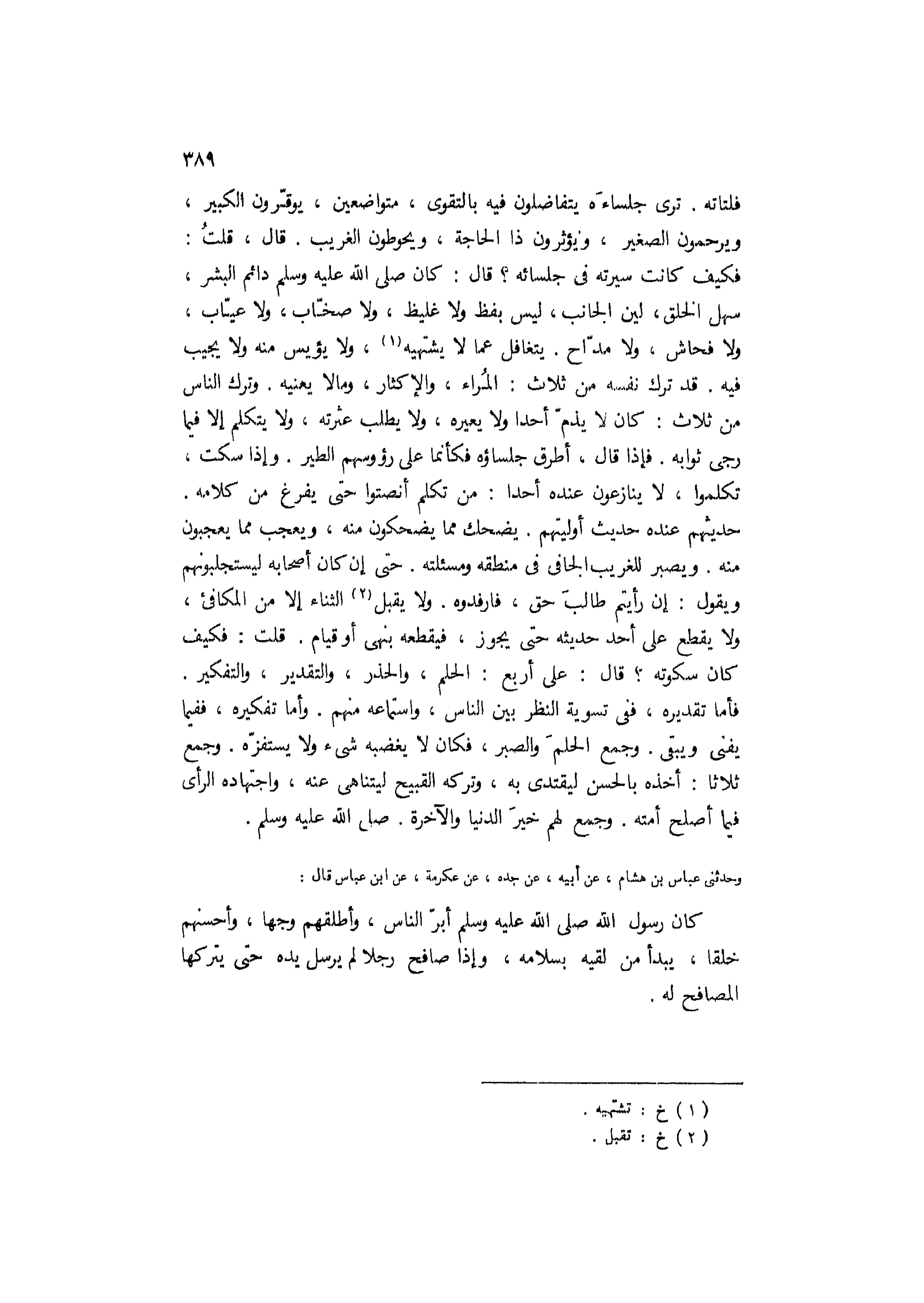 فَلَتَاتُهُ.] [تَرَى جُلَسَاءَهُ يَتَفَاضَلُونَ فِيهِ بِالتَّقْوَى، مُتَوَاضِعِينَ، يوقّرون الكبير، ويرحمون الصغير،] و [يؤثرون ذَا الْحَاجَةِ، وَيَحُوطُونَ الْغَرِيبَ.] قَالَ، قُلْتُ: فَكَيْفَ كَانَتْ سِيرَتُهُ فِي جُلَسَائِهِ؟ قَالَ: [كَانَ صَلَّى اللَّهُ عَلَيْهِ وَسَلَّمَ دَائِمَ الْبِشْرِ، سَهْلَ الْخُلُقِ، لَيِّنَ الْجَانِبِ، لَيْسَ بِفَظٍّ وَلا غَلِيظٍ، وَلا صَخَّابٍ، وَلا عَيَّابٍ،] [وَلا فَحَّاشٍ، وَلا مَدَّاحٍ. يَتَغَافَلُ عَمَّا لا يَشْتَهِيهِ [1] ، وَلا يُؤَيِّسُ مِنْهُ وَلا يُجِيبُ فِيهِ.] قَدْ [تَرَكَ نَفْسَهُ مِنْ ثَلاثٍ: الْمِرَاءِ، وَالإِكْثَارِ، وَمَا لا يَعْنِيهِ. وَتَرَكَ النَّاسَ] [مِنْ ثَلاثٍ: كَانَ لا يَذُمُّ أَحَدًا وَلا يُعَيِّرُهُ، وَلا يَطْلُبُ عَثْرَتَهُ، وَلا يَتَكَلَّمُ إِلا فِيمَا رَجَى ثَوَابَهُ.] فَإِذَا قَالَ، أَطْرَقَ جلساؤه فكأنما على رؤوسهم الطَّيْرُ. وَإِذَا سَكَتَ، تَكَلَّمُوا، لا يُنَازِعُونَ عِنْدَهُ أَحَدًا: مَنْ تَكَلَّمَ أَنْصَتُوا حَتَّى يَفْرُغَ مِنْ كَلامِهِ.