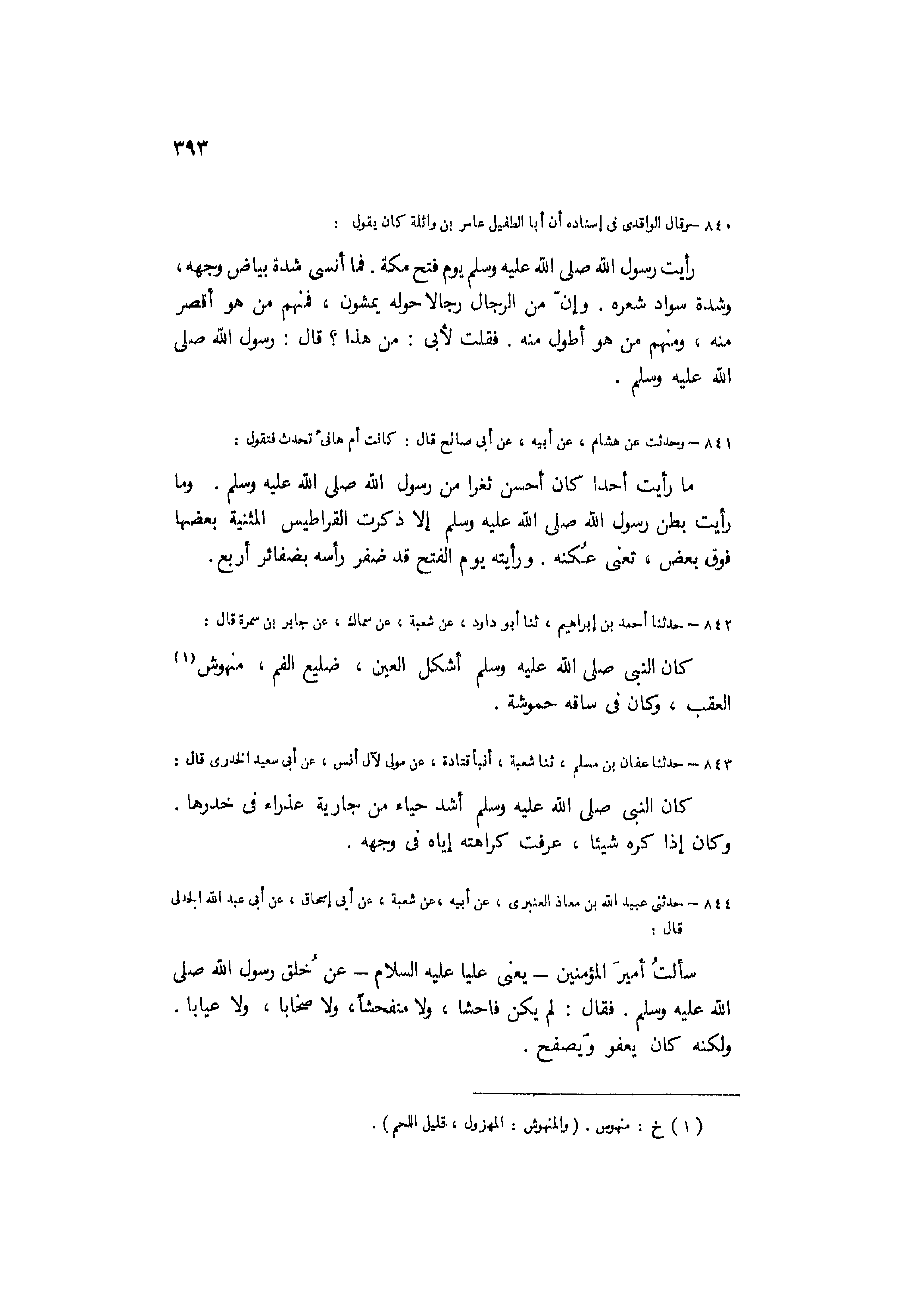 كَانَ النَّبِيُّ صَلَّى اللَّهُ عَلَيْهِ وَسَلَّمَ أَشْكَلَ الْعَيْنِ، ضَلِيعَ الْفَمِ، منهوش [1] الْعَقِبِ، وَكَانَ فِي سَاقِهِ حُمُوشَةٌ.