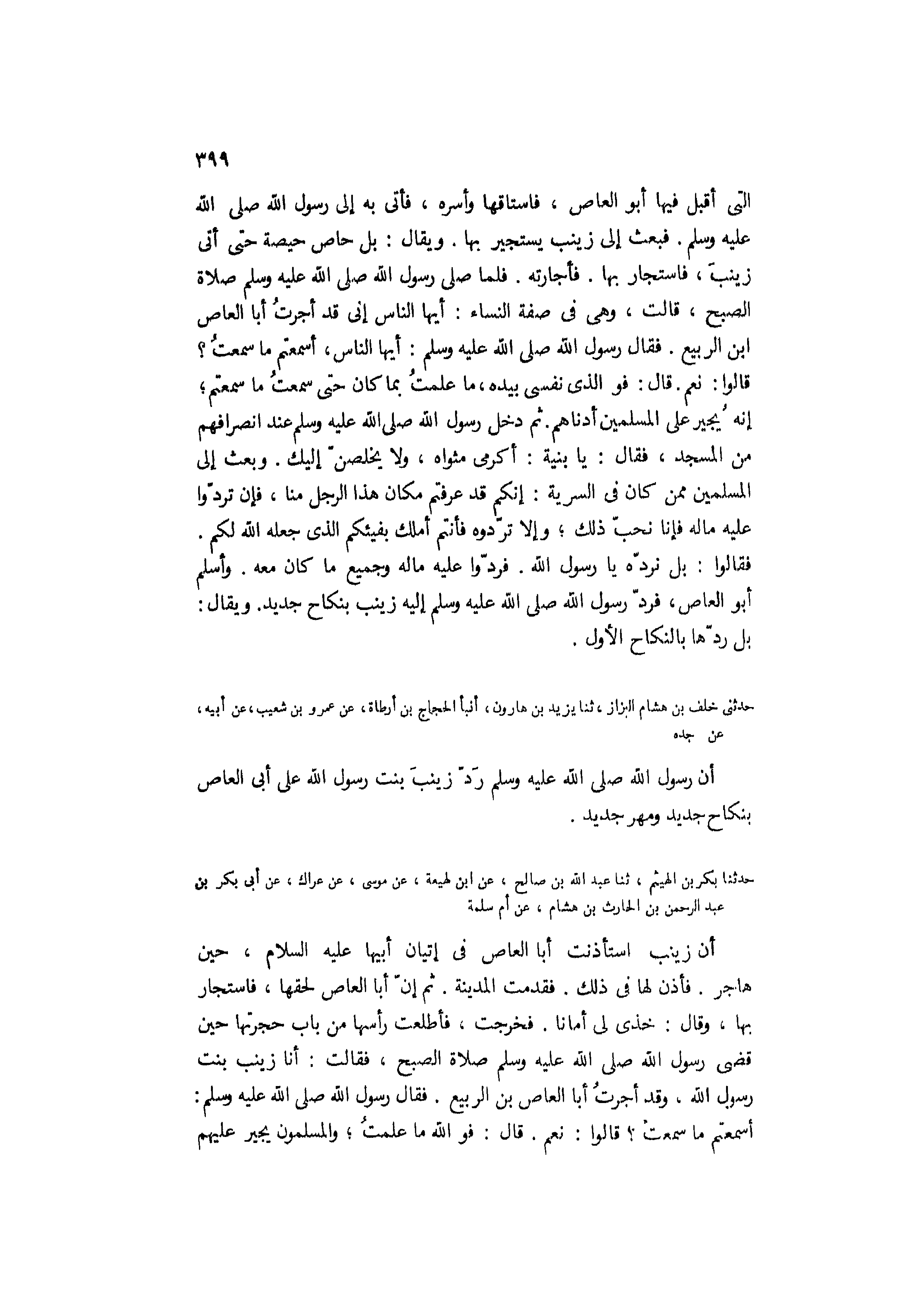 فقالوا: بَلْ نرده يا رسول الله. فردوا عَلَيْهِ ماله وجميع ما كَانَ معه. وأسلم أَبُو العاص، فرد رسول اللَّه صَلَّى اللَّهُ عَلَيْهِ وَسَلَّمَ إِلَيْهِ زينب بنكاح جديد. ويقال: