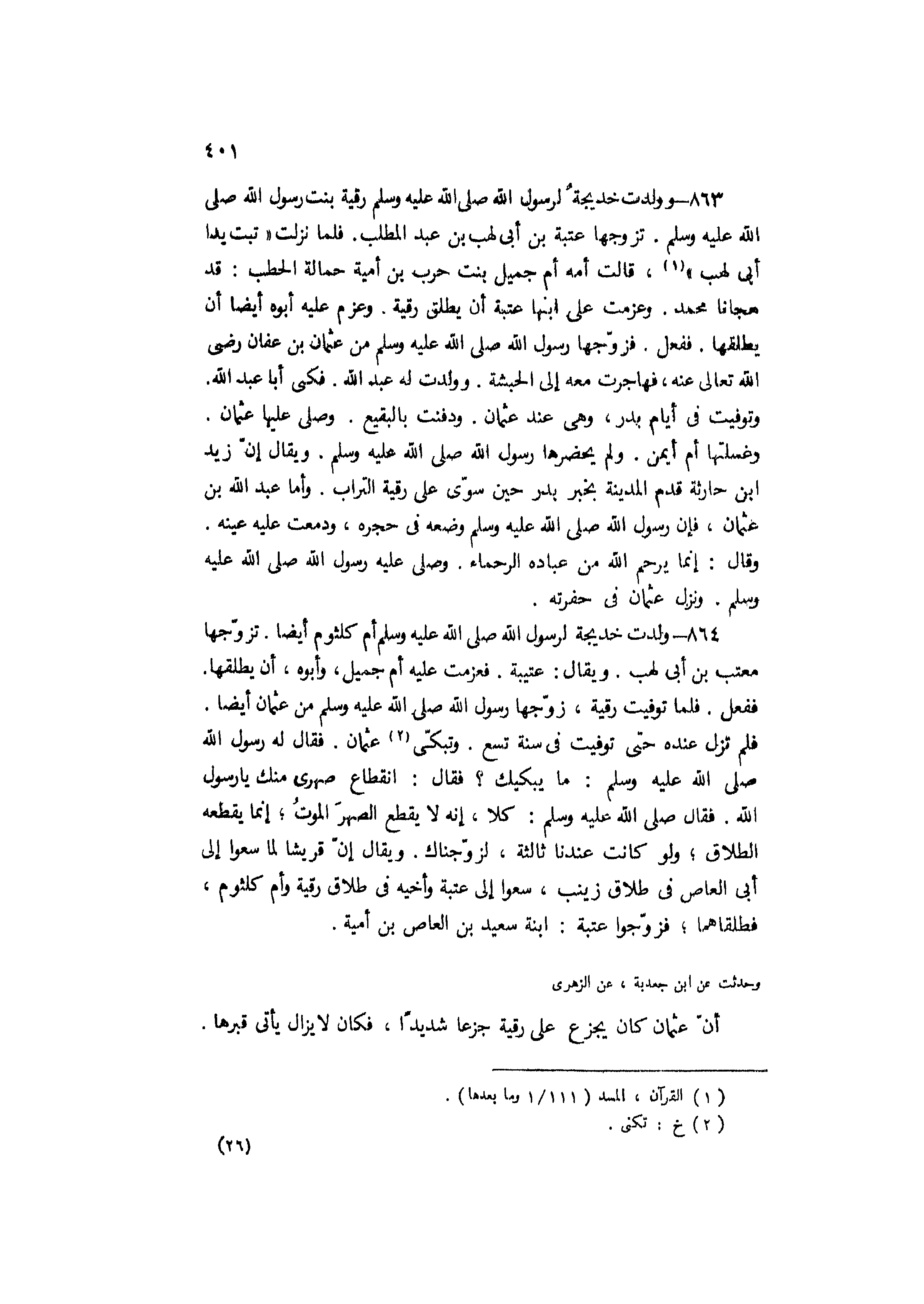 فلم تزل عنده حَتَّى توفيت فِي سنة تسع. وتبكّى [2] عثمان. [فَقَالَ لَهُ رَسُولُ اللَّهِ صَلَّى اللَّهُ عَلَيْهِ وَسَلَّمَ: ما يبكيك؟ فقال: انقطاع صهري منك يا رَسُولُ اللَّهِ. فَقَالَ صَلَّى اللَّهُ عَلَيْهِ وَسَلَّمَ: كلا، إنه لا يقطع الصهر الموت، إنما يقطعه الطلاق، ولو كانت عندنا ثالثة، لزوجناك.] ويقال إن قريشا لِمَا سعوا إلى أبي العاص فِي طلاق زينب، سعوا إلى عتبة وأخيه فِي طلاق رقية وأم كلثوم، فطلقاهما، فزوجوا عتبة: ابنة سعيد بن العاص بن أمية.
