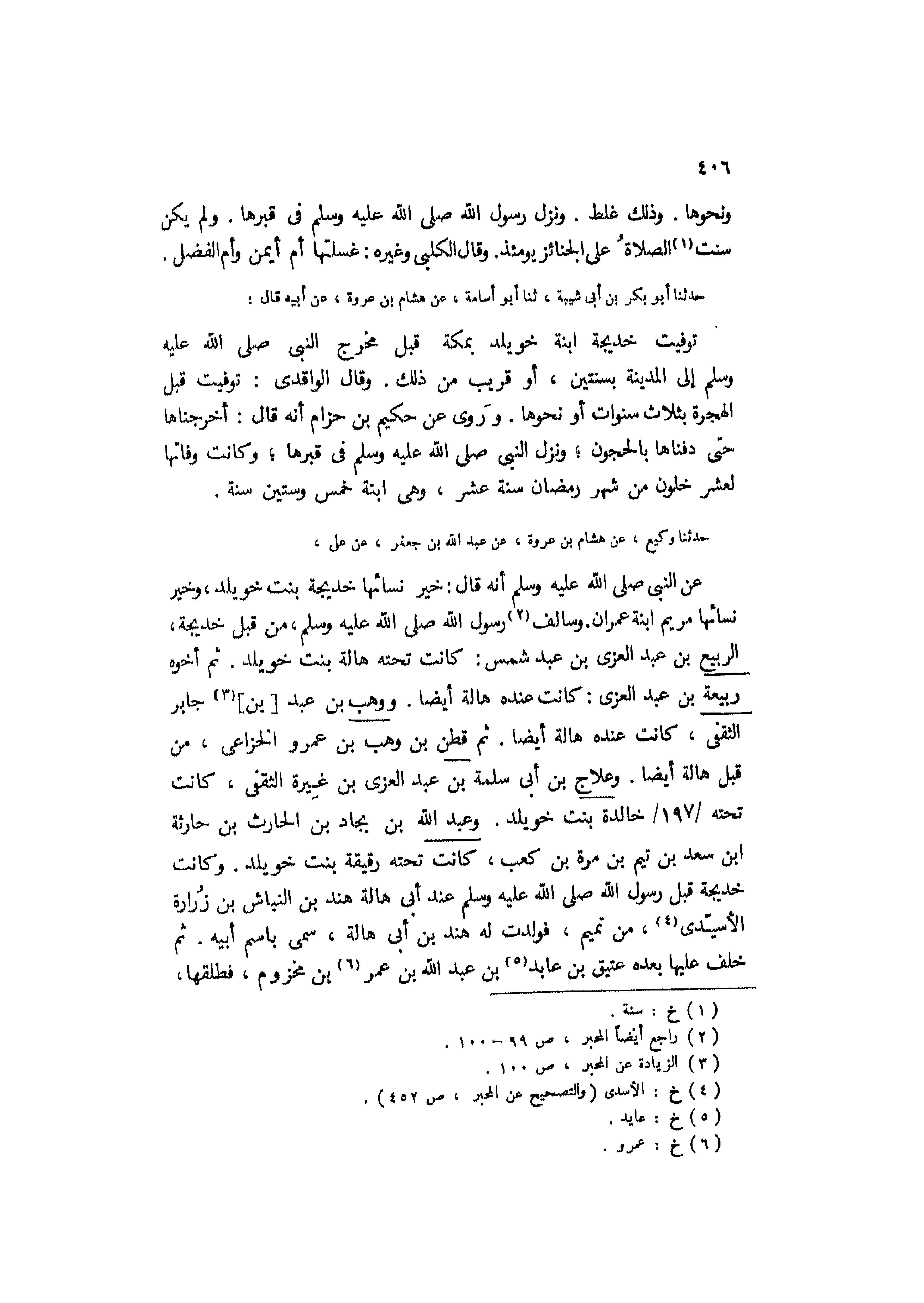 حَدَّثَنَا وَكِيعٌ، عَنْ هِشَامِ بْنِ عُرْوَةَ، عَنْ عَبْدِ اللَّهِ بْنِ جَعْفَرٍ، عَنْ عَلِيٍّ، [عَنِ النَّبِيِّ صَلَّى اللَّهُ عَلَيْهِ وَسَلَّمَ أَنَّهُ قَالَ: خَيْرُ نِسَائِهَا خَدِيجَةُ بِنْتُ خُوَيْلِدٍ، وَخَيْرُ نِسَائِهَا مَرْيَمُ ابْنَةُ عِمْرَانَ.] وسالف [2] رَسُول اللَّهِ صَلَّى اللَّهُ عَلَيْهِ وَسَلَّمَ، من قبل خديجة، الربيع بن عبد العزى بن عبد شمس: كانت تحته هالة بنت خويلد. ثُمَّ أخوه ربيعة بن عبد العزى: كانت عنده هالة أيضا. ووهب بن عبد (بن) [3] جابر الثقفي، كانت عنده هالة أيضا. ثُمَّ قطن بن وهب بن عمرو الخزاعي، من قبل هالة أيضا. وعلاج بْن أبي سلمة بْن عبد العزي بْن غيرة الثقفي، كانت تحته/ 197/ خالده بنت خويلد. وعبد الله بن بجاد بن الحارث بن حارثة ابن سَعْد بْن تيم بْن مرة بْن كعب، كانت تحته رقيقة بنت خويلد. وكانت خديجة قَبْلَ رَسُول اللَّهِ صَلَّى اللَّهُ عَلَيْهِ وَسَلَّمَ عند أبي هالة هند بن النباش بن زرارة الأسيدي [4] ، من تميم، فولدت لَهُ هند بن أبي هالة، سمي باسم أبيه. ثُمَّ خلف عليها بعده عتيق بن عابد [5] بْن عَبْد اللَّهِ بْن عُمَر [6] بْن مخزوم، فطلقها،