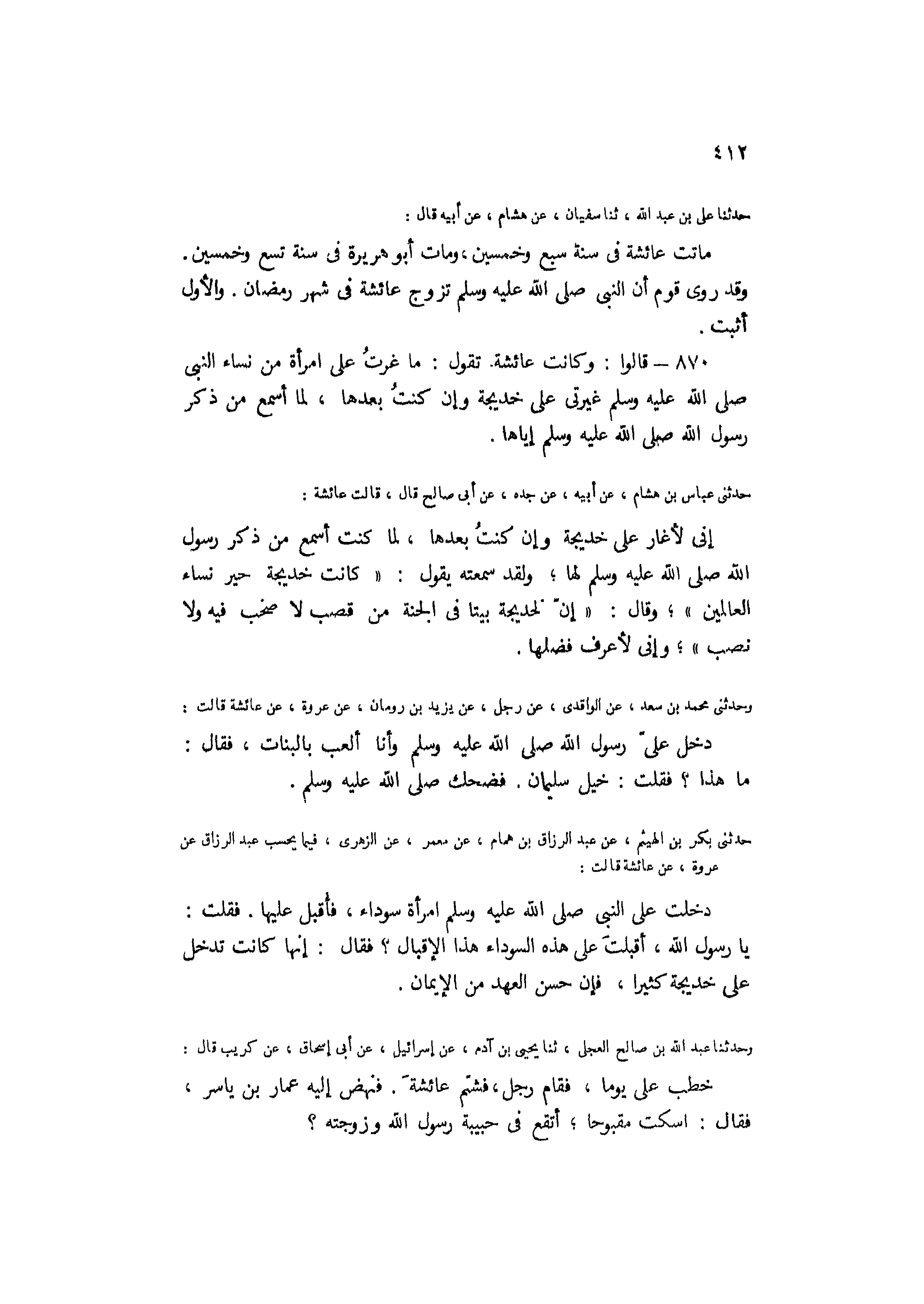 870- قالوا: وكانت عائشة تَقُولُ: ما غرت عَلَى امرأة من نساء النَّبِيّ صَلَّى اللَّهُ عَلَيْهِ وَسَلَّمَ غيرتي عَلَى خديجة وإن كَنت بعدها، لِمَا أسمع من ذكر رَسُول اللَّهِ صَلَّى اللَّهُ عَلَيْهِ وَسَلَّمَ إياها.