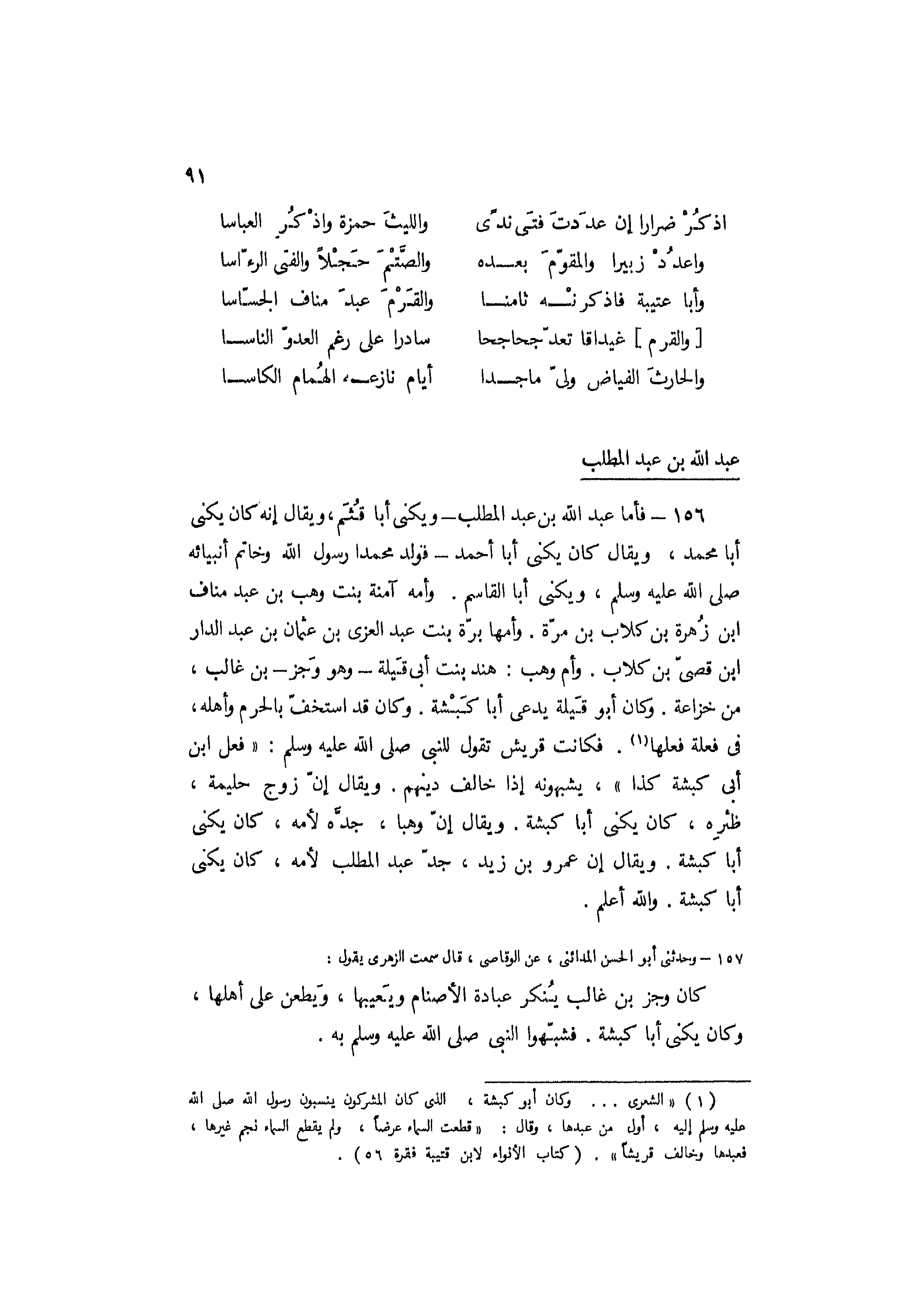 156- فأما عبد اللَّه بن عبد المطلب- ويكنى أبا قثم، ويقال إنه كان يكنى أبا محمد، ويقال كان يكنى أبا أحمد- قولد محمدا رسول اللَّه وخاتم أنبيائه صلى اللَّه عليه وسلم، ويكنى أبا القاسم. وأمه آمنة بنت وهب بن عبد مناف ابن زهرة بن كلاب بن مرة. وأمها برة بنت عَبْدِ الْعُزَّى بْنِ عُثْمَانَ بْنِ عَبْدِ الدَّارِ ابن قصي بن كلاب. وأم وهب: هند بنت أبي قيلة- وهو وجز- بن غالب، من خزاعة. وكان أبو قيلة يدعى أبا كبشة. وكان قد استخف بالحرم وأهله، في فعلة فعلها [1] . فكانت قريش تقول للنبي صلى اللَّه عليه وسلم: «فعل ابن أبي كبشة كذا» ، يشبهونه إذا خالف دينهم. ويقال إن زوج حليمة، ظئره، كان يكنى أبا كبشة. ويقال إن وهبا، جده لأمه، كان يكنى أبا كبشة. ويقال إن عمرو بن زيد، جد عبد المطلب لأمه، كان يكنى أبا كبشة. واللَّه أعلم.