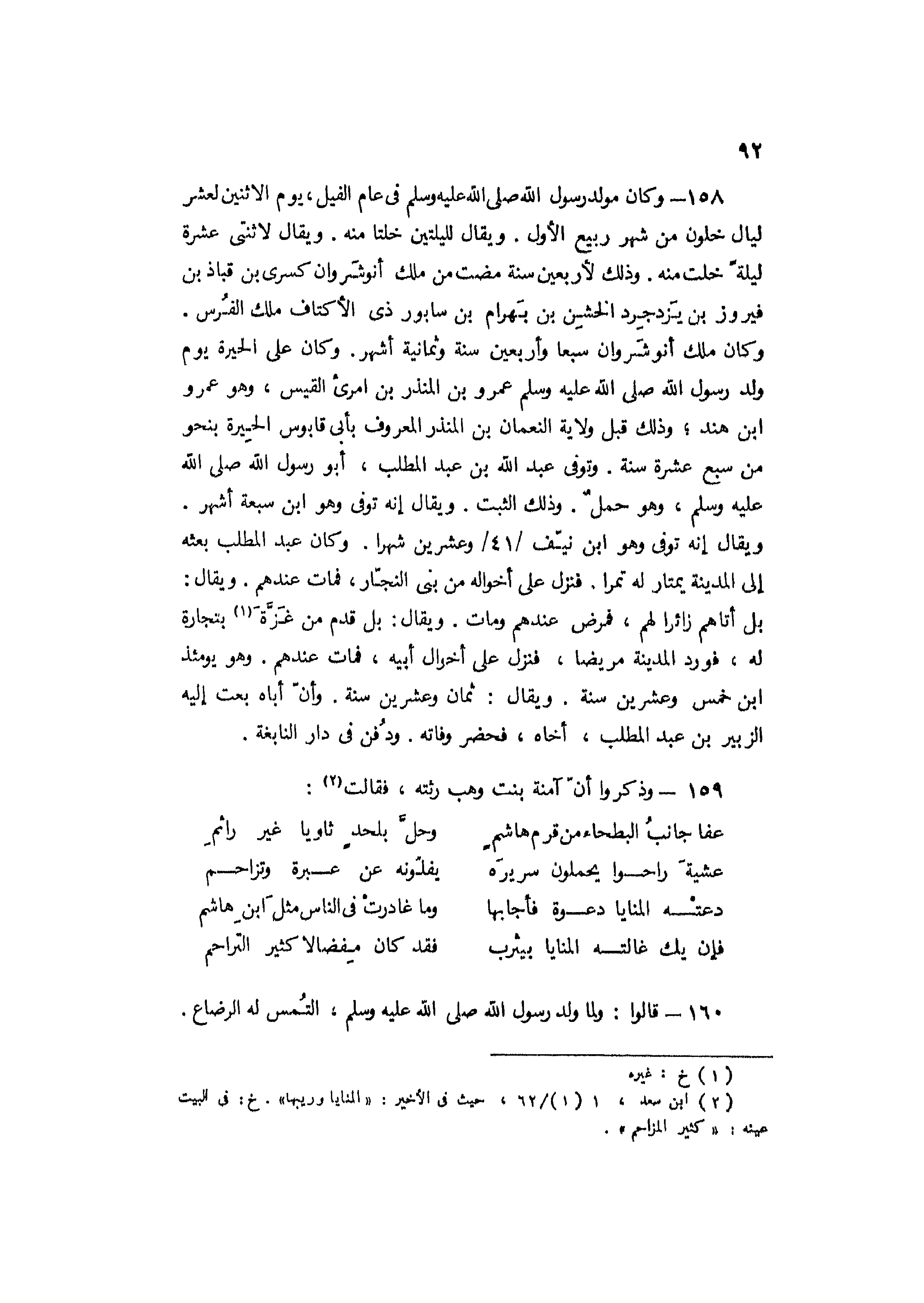 158- وكان مولد رَسُول اللَّه صَلَّى اللَّه عَلَيْهِ وَسَلَّمَ في عام الفيل، يوم الاثنين لعشر ليال خلون من شهر ربيع الأول. ويقال لليلتين خلتا منه. ويقال لاثنتي عشرة ليلة خلت منه. وذلك لأربعين سنة مضت من ملك أنوشروان كسرى بن قباذ بن فيروز بن يزدجرد الخشن بن بهرام بن سابور ذي الأكتاف ملك الفرس.