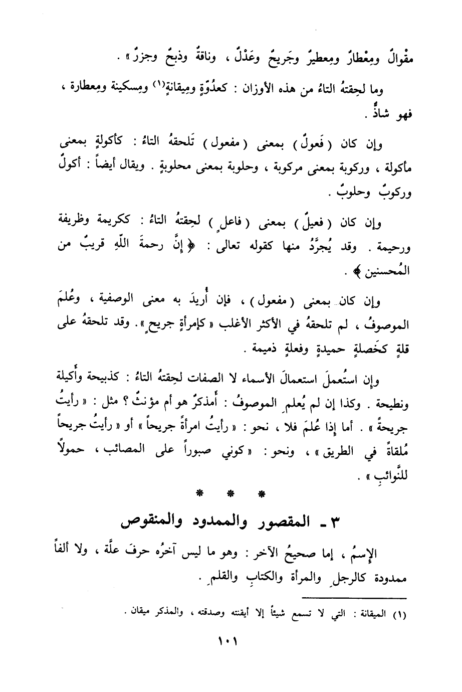 وما لحِقتهُ التاءُ من هذه الأوزان كعدُوَّةٍ ومِيقانةٍ ومِسكينة ومِعطارة، فهو شاذٌّ.