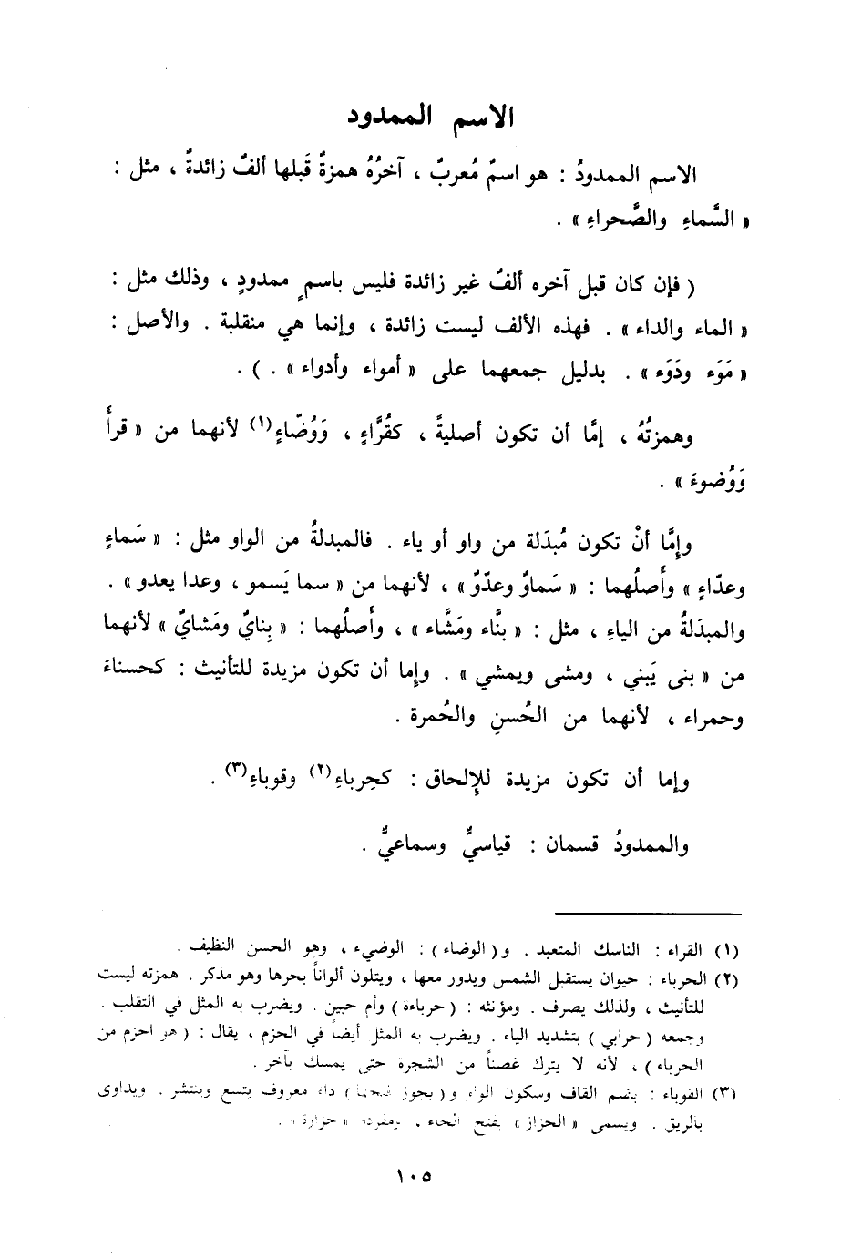 (فان كان قبل آخره ألفٌ غير زائدة فليس باسمٍ ممدودٍ، وذلك مثل "الماء والداء". فهذه الألفُ ليست زائدة، وانما هي منقلبة. والاصل "مَوَء ودَوَء". بدليل جمعهما على "أمواء وأدواء") .