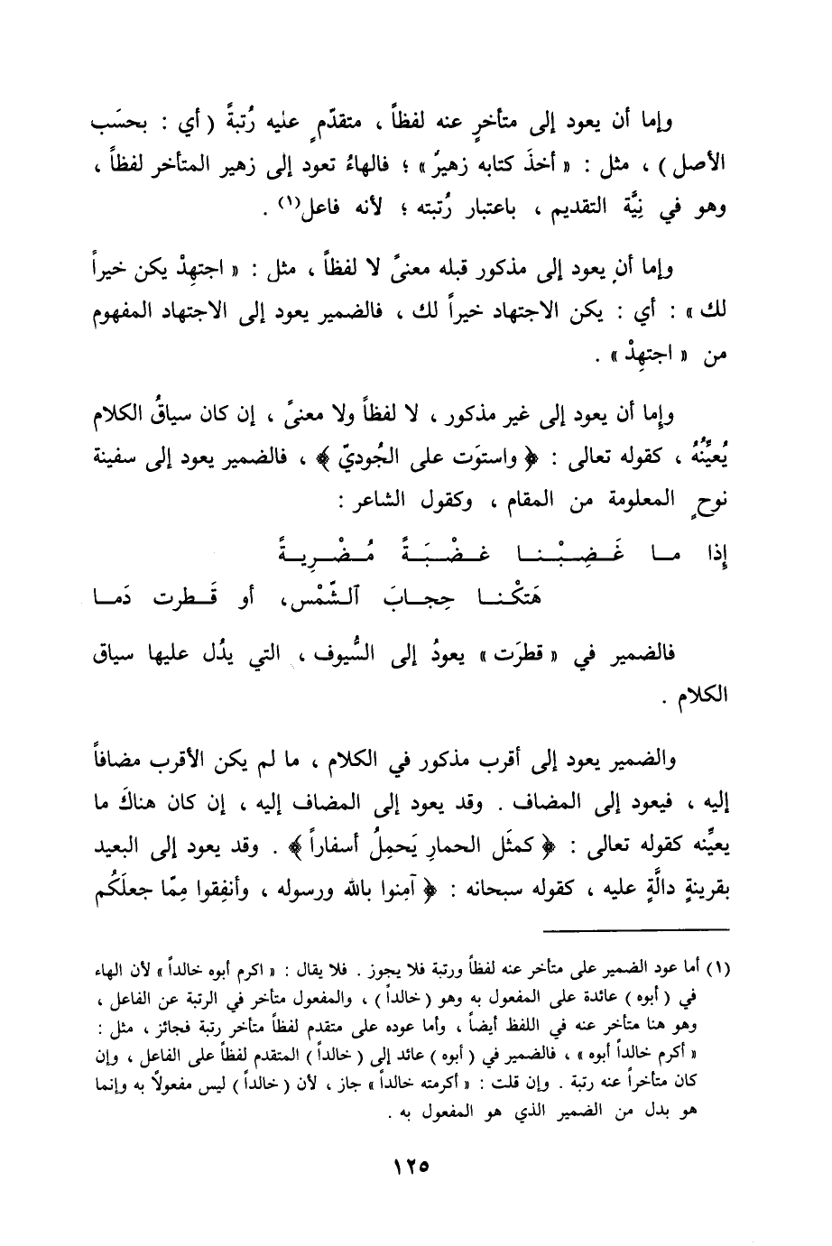 والضمير يعود الى أقرب مذكور في الكلام، ما لم يكن الأقرب مضافاً اليه، فيعود الى المضاف. وقد يعود الى المضاف اليه، إن كان هناكَ ما يعيِّنه كقوله تعالى "كمثَل الحمارِ يَحمِلُ أسفاراً". وقد يعود الى البعيد بقرينةٍ دالَّةٍ عليه، كقوله سبحانه {آمِنوا بالله ورسوله، وأنفِقوا مِمّا جعلَكُم