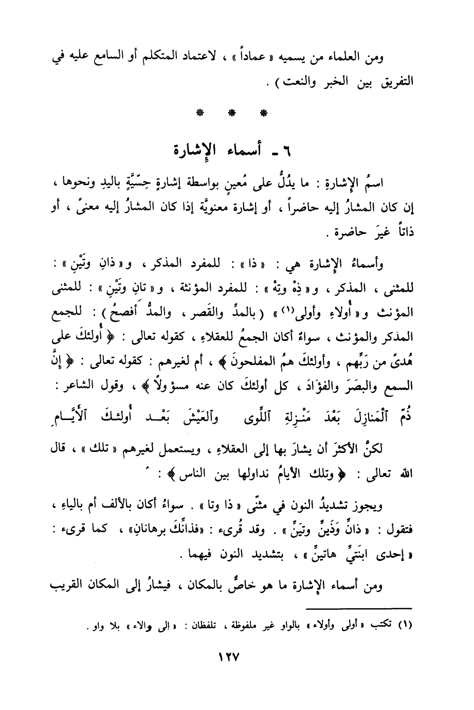 وأسماءُ الإشارة هي "ذا" للمفرد المذكر، و"ذانِ وَتْينِ" للمثنى، المذكر، و"ذِهْ وتِهْ" للمفرد المؤنثة، و"تانِ وتَيْنِ" للمثنى المؤنث و"أُولاءِ واولى" (بالمدِّ والقَصر، والمدُّ أفصحُ) للجمع المذكر والمؤنث، سواءٌ أكان الجمعُ للعقلاءِ، كقوله تعالى: {أولئك على هُدًى مِّن رَّبِّهِمْ وأولئك هُمُ المفلحون} [البقرة: 5] أم لغيرهم: كقوله تعالى: {إِنَّ السمع والبصر والفؤاد كُلُّ أولئك كَانَ عَنْهُ مَسْؤُولاً} [الإسراء: 36] ، وقول الشاعر: [من الكامل]