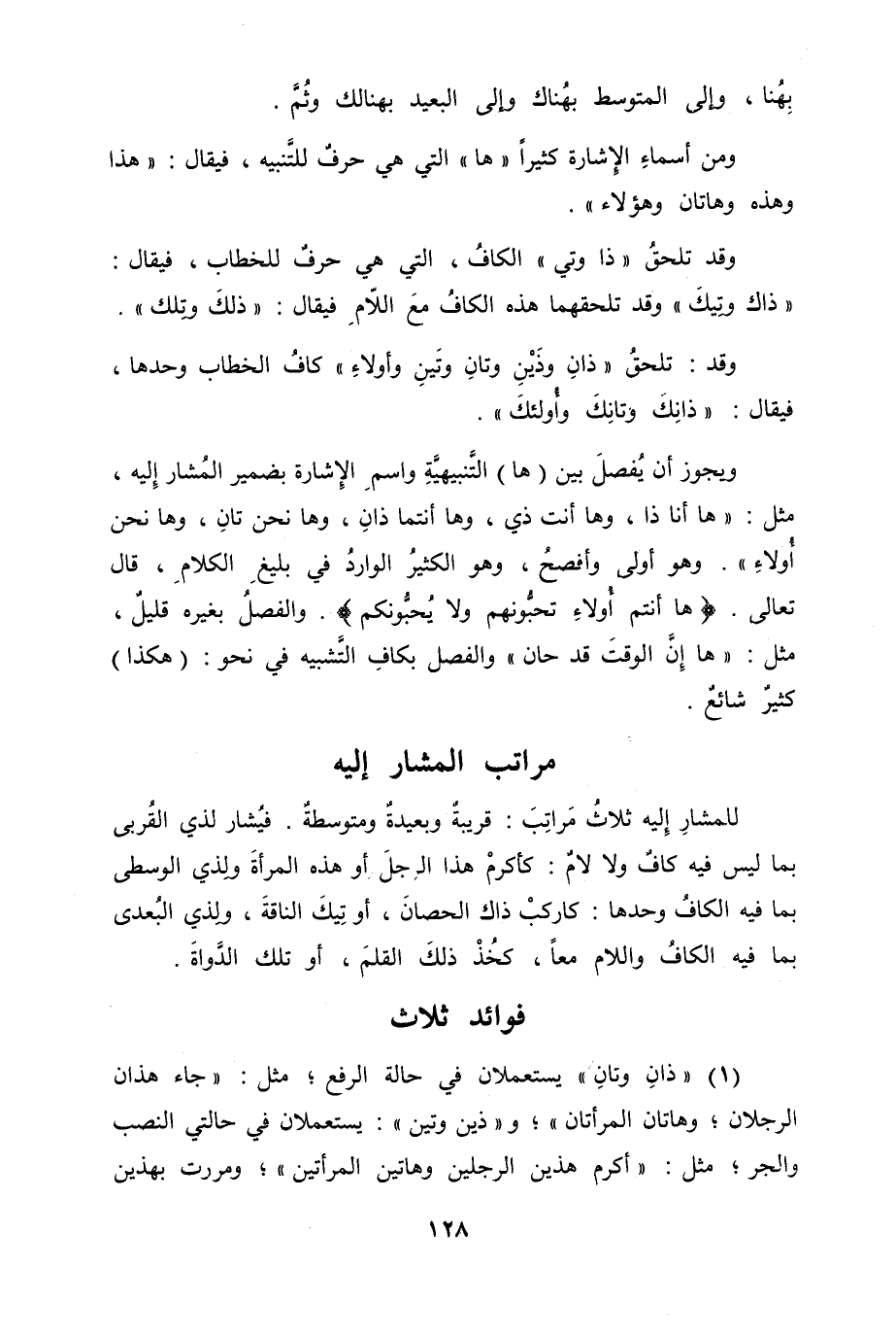 للمشارِ إليه ثلاثُ مَراتِبَ قريبةٌ وبعيدةٌ ومتوسطةٌ. فيُشار لذي القُربى بما ليس فيه كافٌ ولا لامٌ كأكرمْ هذا الرجلَ أو هذه المرأةَ ولِذي الوسطى بما فيه الكافُ وحدها كاركبْ ذاك الحصانَ، أو تِيكَ الناقةَ، ولِذي البُعدى بما فيه الكافُ واللام معاً، كخُذْ ذلكَ القلمَ، أو تلك الدَّواةَ.