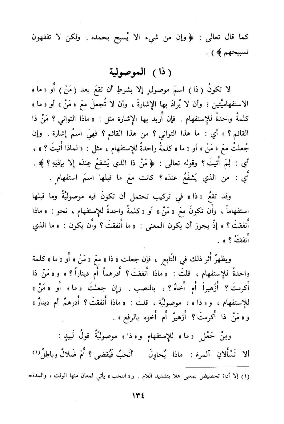وقد تقعُ "ذا" في تركيب تحتمل أن تكونَ فيه موصوليَّةً وما قبلها استفهاماً، وأَن تكونَ معَ "مَنْ" أو "كلمةً واحدةً للإستفهام، نحو "ماذا أَنفقتَ؟ " إِذْ يجوز أن يكون المعنى "ما أَنفقتَ؟ وأَن يكون "ما الذي أَنفقتَهُ؟ ".