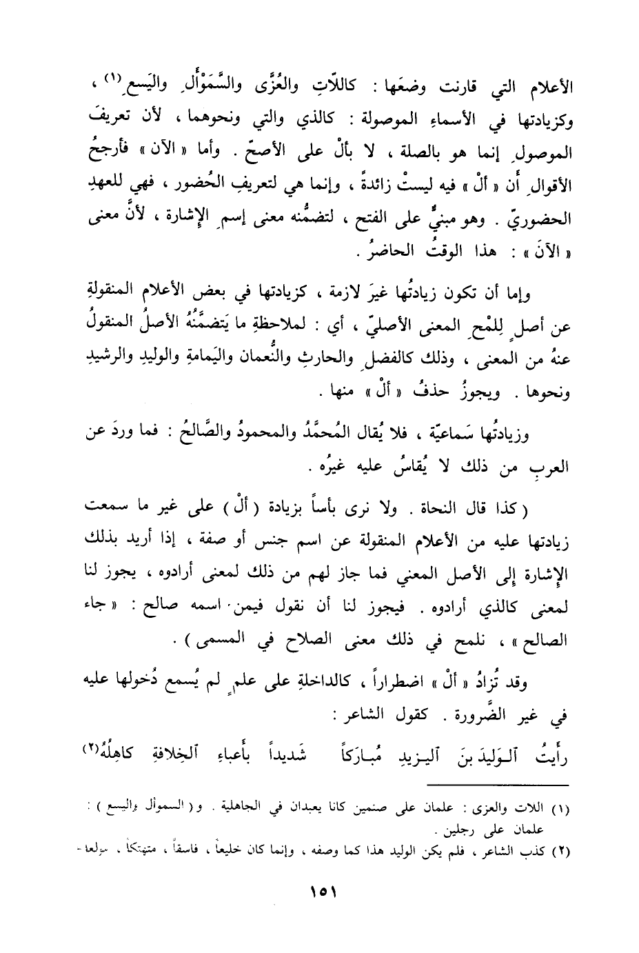 (كذا قال النحاة. ولا نرى بأساً بزيادة (ألْ) على غير ما سمعت زيادتها عليه من الأعلام المنقولة عن اسم جنس أو صفة، إذا اريد بذلك الإشارة إلى الأصل المعني فما جاز لهم من ذلك لمعنى أرادوه، يجوز لنا لمعنى كالذي أرادوه. فيجوز لنا أن نقول فيمن اسمه صالح "جاء الصالح"، نلمح في ذلك معنى الصلاح في المسمى) .