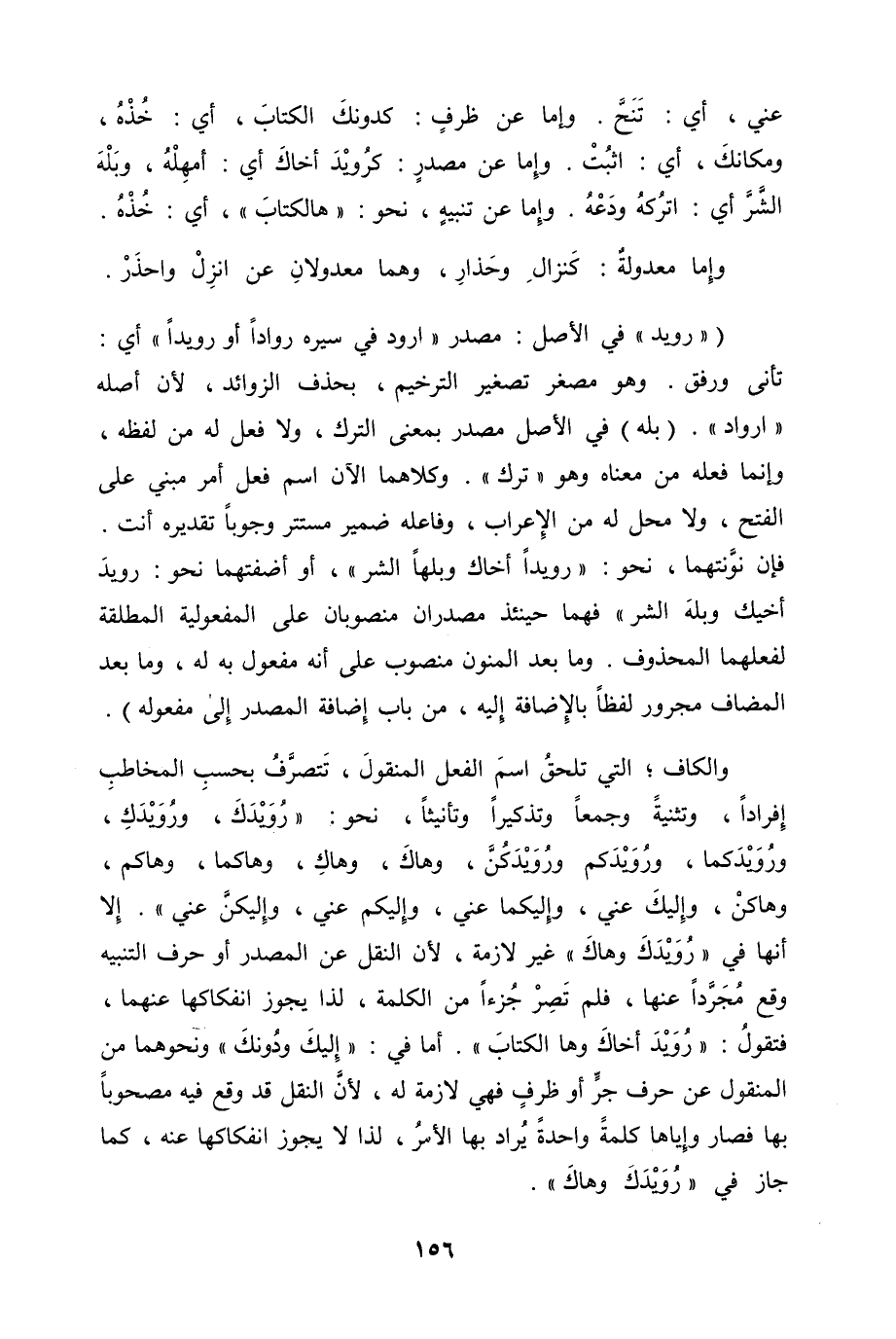 ("رويد" في الأصل مصدر "ارود في سيره رواداً أو رويداً" أي تأنى ورفق. وهو مصغر تصغير الترخيم، بحذف الزوائد، لأن أصله "ارواد". (بله) في الأصل مصدر بمعنى الترك، ولا فعل له من لفظه، وإنما فعله من معناه وهو "ترك". وكلاهما الآن اسم فعل أمر مبني على الفتح، ولا محل له من الإعراب، وفاعله ضمير مستتر وجوباً تقديره أنت. فإن نوَّنتهما، نحو "رويداً أخاك وبلهاً الشر"، أو أضفتهما نحو رويدَ أخيك وبلهُ الشر" فهما حينئذ مصدران منصوبان على المفعولية المطلقة لفعلهما المحذوف. وما بعد المنون منصوب على أنه مفعول به له، وما بعد المضاف مجرور لفظاً بالإضافة إليه، من باب إِضافة المصدر إلى مفعوله) .