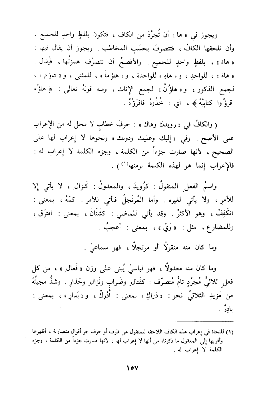 (والكافُ في "رويدك وهاك" حرفٌ خطابٍ لا محل له من الإعراب علىالأصح. وفي "إليك وعليك ودونك" ونحوها لا إعراب لها على الصحيح، لأنها صارت جزءاً من الكلمة، وجزء الكلمة لا إِعراب له فالإعراب إنما هو لهذه الكلمة برمتها) .