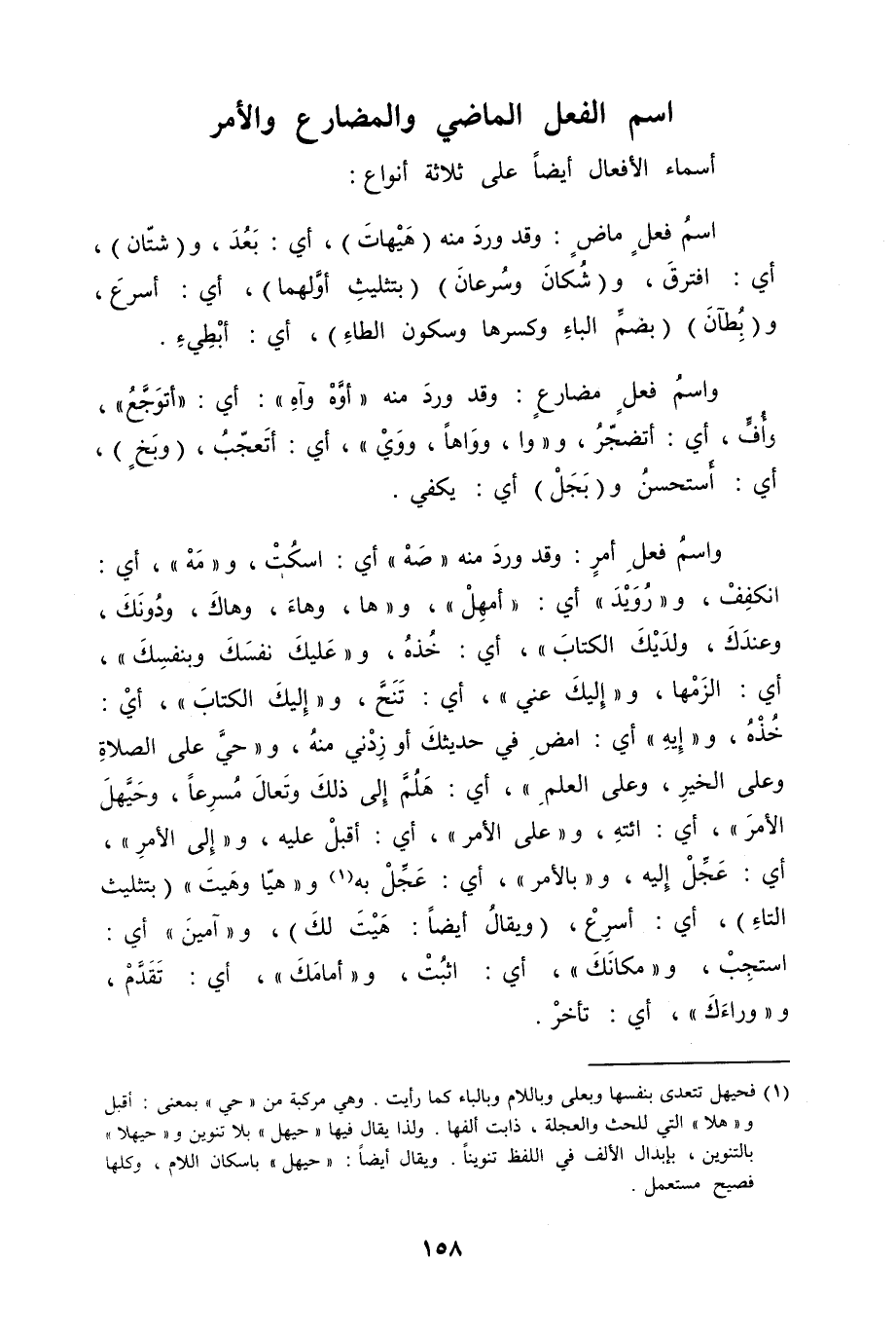 واسمُ فعلِ أمرٍ وقد وردَ منه "صّهْ" أي اسكُتْ، و"مَهْ"، أي انكفِفْ، و"رُوَيْدَ" أي "أمهِلْ"، و"ها، وهاءَ، وهاكَ، ودُونَكَ، وعندَكَ، ولدَيْكَ الكتابَ"، أي خُذهُ، و"عَليكَ نفسَكَ وبنفسِكَ"، أي الزَمْها، و"إِليكَ عني"، أي تَنَحَّ، و"إِليكَ الكتابَ"، أيْ خُذْهُ، و"إيهِ" أي امضِ في حديثكَ أو زِدْني منهُ، و"حيَّ على الصلاةِ وعلى الخيرِ، وعلى العلمِ"، أي هَلُمَّ إلى ذلكَ وتَعالَ مُسرِعاً، وحَيَّهلَ الأمرَ"، أي ائتهِ، و"على الأمر"، أي أقبلْ عليه، و"إِلى الأمرِ"، أي عَجَّلْ إليه، و"بالأمر"، أي عَجِّلْ به و"هيّا وهَيتَ" (بتثليث التاءِ) ، أي أسرِعْ، (ويقالُ أيضاً هَيْتَ لكَ) ، و"آمينَ" أي استجِبْ، و"مكانَكَ"، أي اثبُتْ، و"أمامَكَ"، أي تَقَدَّمْ، و"وراءِكَ"، أي تأخرْ.