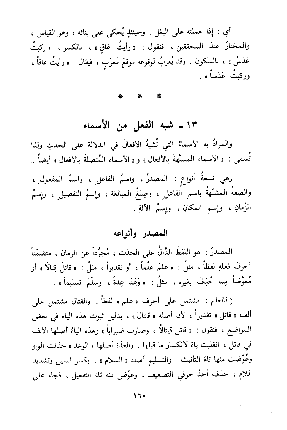 (فالعلم مشتمل على أحرف "علم" لفظاً. والقتال مشتمل على ألف "قاتل" تقديراً، لأن أصله "قيتال"، بدليل ثبوت هذه الياء في بعض المواضع، فنقول "قاتل قيتالاً، وضارب ضيراباً" وهذه الياءُ أصلها الألف في قاتل، انقلبت ياءً لانكسار ما قبلها. والعدّة أصلها "الوعد" حذفت الواو وعُوّضت منها تاءُ التأنيث. والتسليم أصله "السلام". بكسر السين وتشديد اللام، حذف أحدُ حرفي التضعيف، وعوّض منه تاءَ التفعيل، فجاء على