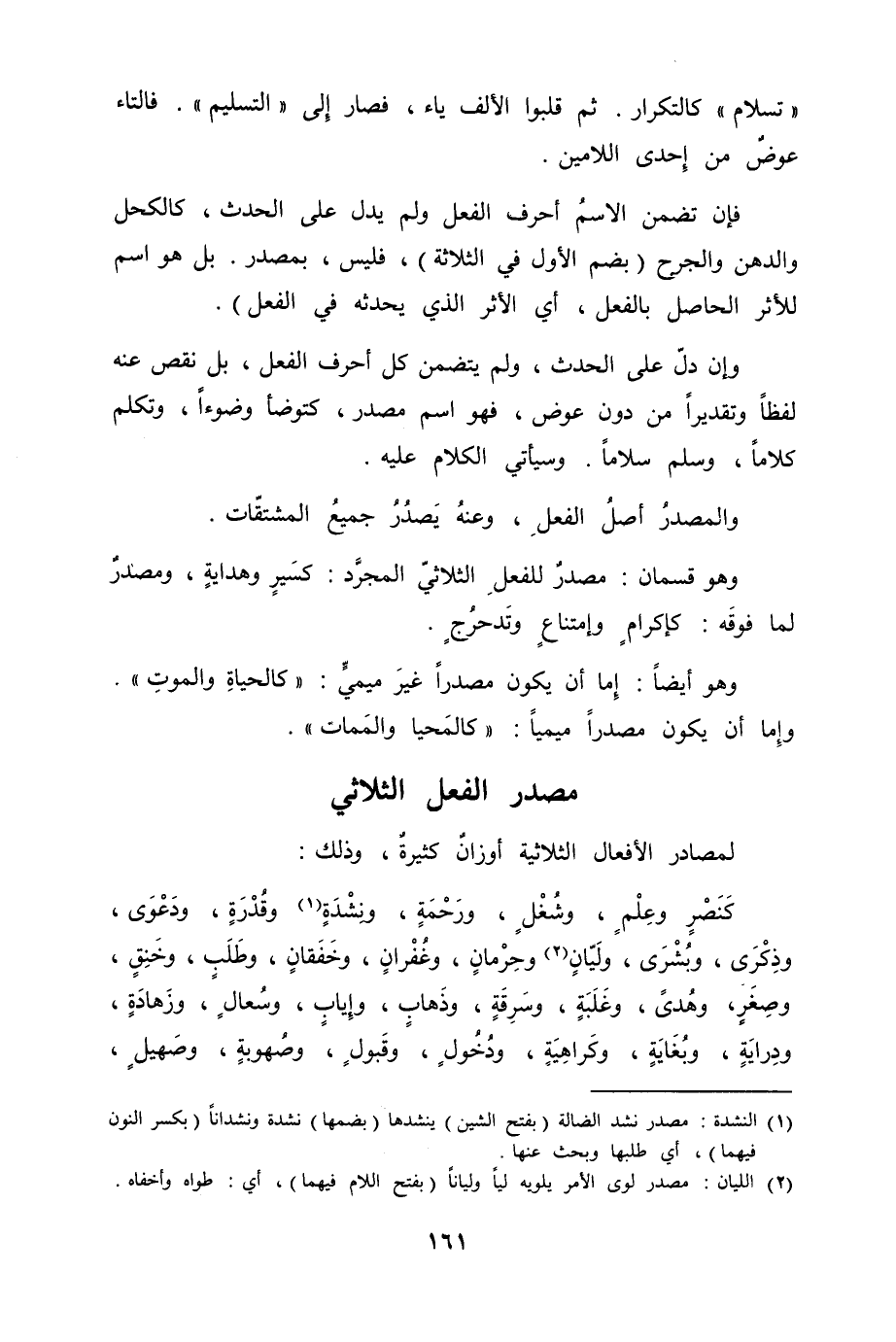وان دلّ على الحدث، ولم يتضمن كل أحرف الفعل، بل نقص عنه لفظاً وتقديراً من دون عوض، فهو اسم مصدر، كتوضأ وضوءاً، وتكلم كلاماً، وسلم سلاماً، وسيأيت الكلام عليه.