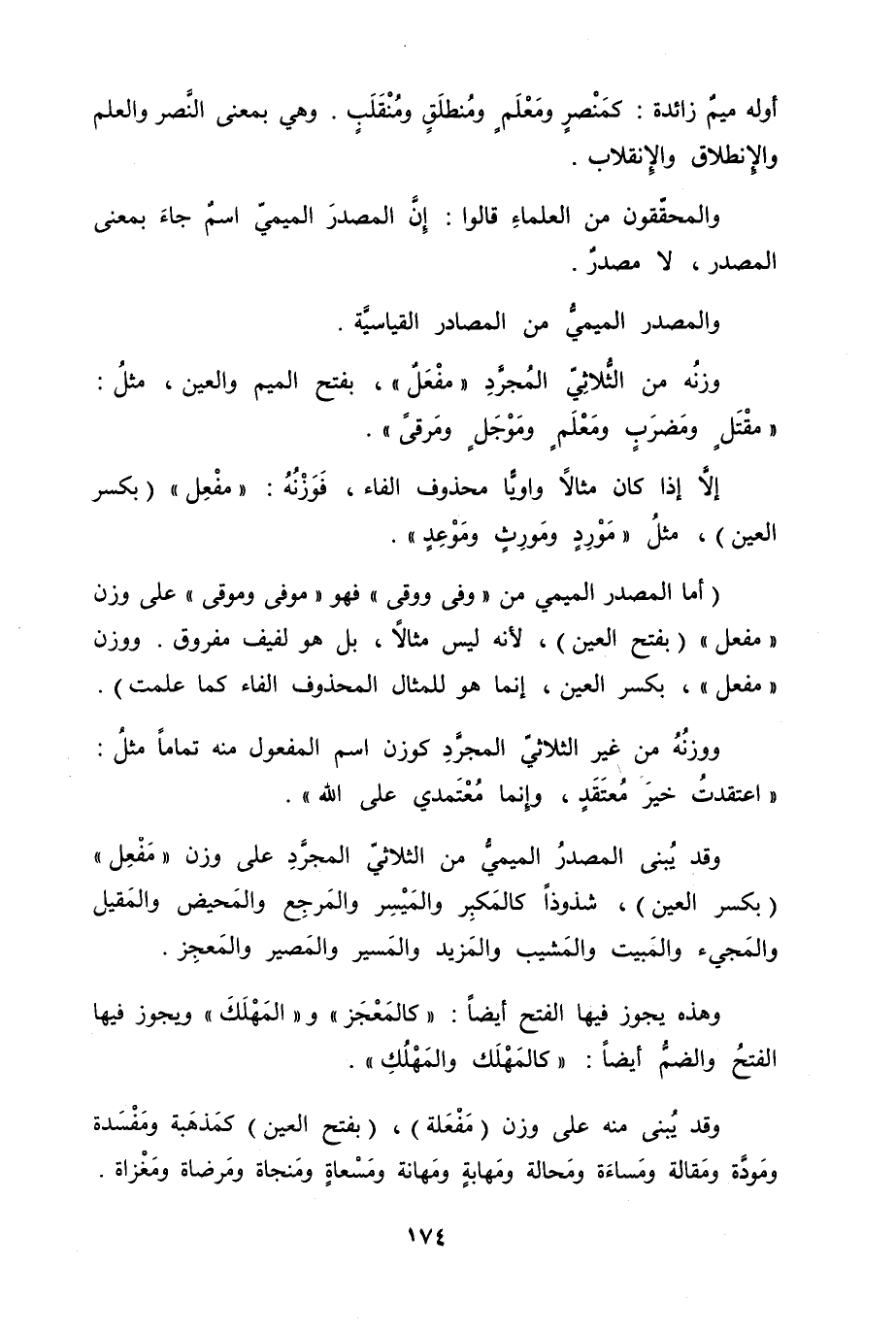 (أما المصدر الميمي من "وفى ووقى" فهو "موفى وموقى" على وزن "مفعل" (بفتح العين) ، لأنه ليس مثالا، بل هو لفيف مفروق. ووزن "مفعل"، بكسر العين، انما هو للمثال المحذوف الفاء كما علمت) .