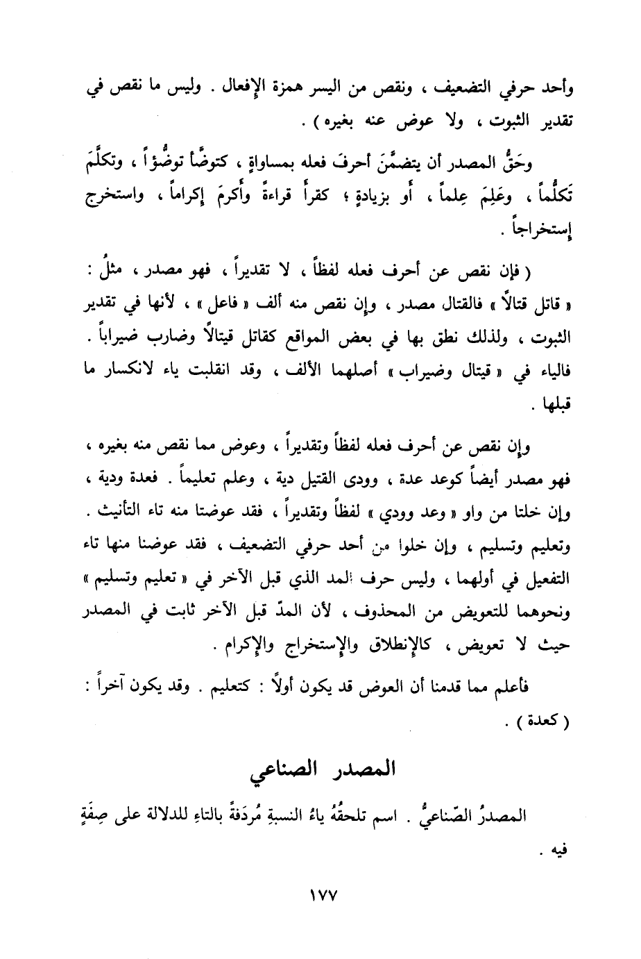وإن نقص عن أحرف فعله لفظاً وتقديراً، وعوض مما نقص منه بغيره، فهو مصدر أيضاً كوعد عدة، وودى القتيل دية، وعلم تعليماً. فعدة ودية، وإن خلتا من واو "وعد وودي" لفظاً وتقديراً، فقد عوضتا منه تاء التأنيث. وتعليم وتسليم، وان خلوا من أحد حرفي التضعيف، فقد عوضنا منها تاء التفعيل في أولهما، وليس حرف المد الذي قبل الآخر في "تعليم وتسليم" ونحوهما للتعويض من المحذوف، لأن المدّ قبل الآخر ثابت في المصدر حيث لا تعويض، كالإنطلاق والإستخراج والإكرام.