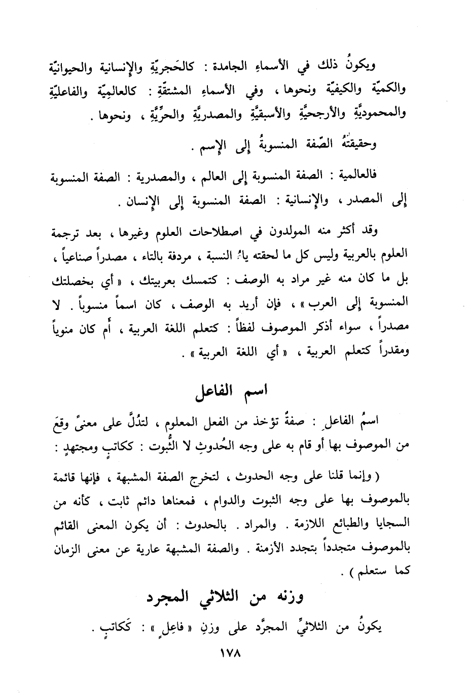وقد أكثر منه المولدون في اصطلاحات العلوم وغيرها، بعد ترجمة العلوم بالعربية وليس كل ما لحقته ياءُ النسبة، مردفة بالتاء، مصدراً صناعياً، بل ما كان منه غير مراد به الوصف كتمسكّ بعربيتك، "أي بخصلتك المنسوبة إِلى العرب"، فان أريد به الوصف، كان اسماً منسوباً. لا مصدراً، سواء أذكر الموصوف لفظاً كتعلم اللغة العربية، أَم كان منوياً ومقدراً كتعلم العربية، "أي اللغة العربية".