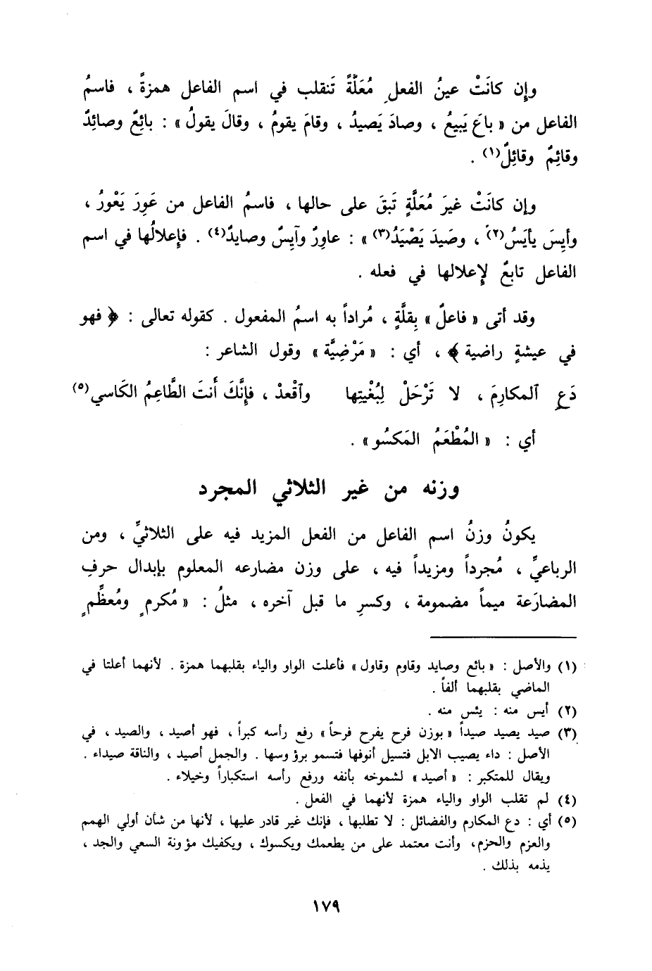 وإن كانَتْ غيرَ مُعَلَّةٍ تَبقَ على حالها، فاسمُ الفاعل من عَوِرَ يَعْورُ، وأيِسَ يأيَسُ، وصَيدَ يَصْيَدُ" عاوِرٌ وأيِسٌ وصايدٌ. فإعلاُلها في اسم الفاعل تابعٌ لإِعلالها في فعله.