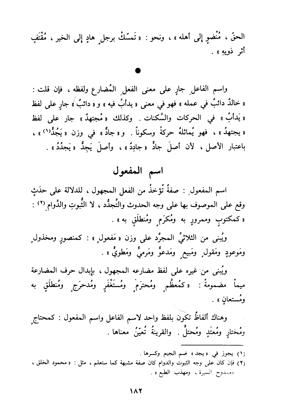 واسم الفاعلِ جارٍ على معنى الفعلِ المُضارع ولفظه، فإن قلت "خالدٌ دائبٌ في عمله" فهو في معنى "يدأبُ فيه" و"دائبٌ" جارٍ على لفظ "يَدأبُ" في الحركات والسَّكنات. وكذلك "مُجتهدٌ" جار على لفظ "يجتهدُ"، فهو يُماثلهُ حركةً وسكوناً. و"جادٌّ" في وزن "يَجُدُّ"، باعتبار الأصل، لأن أصل جَادٍّ "جادِدٌ"، وأصلَ يَجِدُّ "يَجدُدُ".