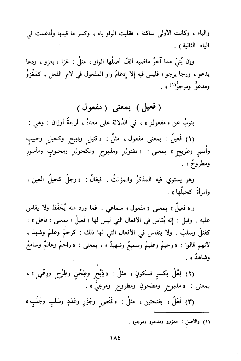 (1) فَعيلٌ بمعنى مفعول، مثلُ "قتيلٍ وذبيحٍ وكحيلٍ وحبيبٍ وأَسيرٍ وطريحٍ" بمعنى "مقتولٍ ومذبوحٍ ومكحولٍ ومحبوبٍ ومأسورٍ ومطروحٍ".