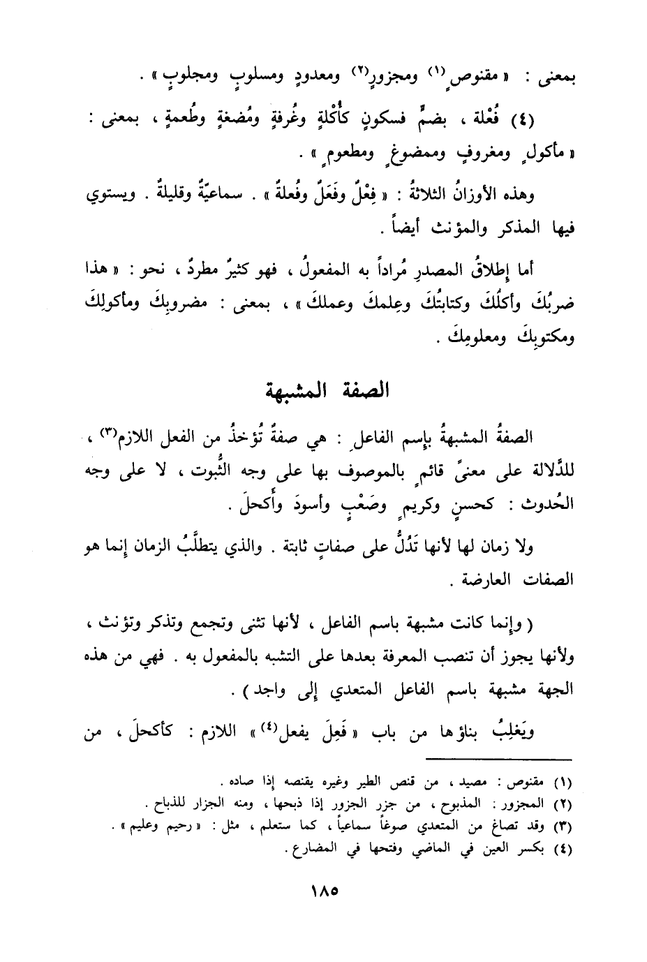 ولا زمان لها لأنها تَدُلُّ على صفاتٍ ثابتة. والذي يتطلَّبُ الزمان إِنما هو الصفات العارضة.