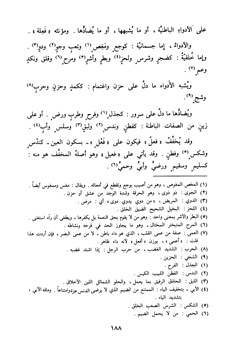 ويَضادّها ما دلَّ على سرور كجذلٍ وفرحٍ وطربٍ ورضٍ. أو على زينٍ من الصفات الباطنة كفطنٍ وندس ولبقٍ وسلسٍ وأبٍ.