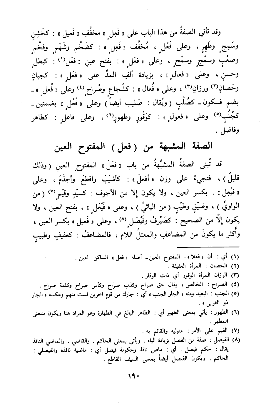 وقد تأبي الصفةُ من هذا الباب على "فَعِلٍ" مخفَّفٍ "فَعيل" كخَشِنٍ وسَمِجٍ وطَهِرٍ، وعلى فَعْلٍ، مُخفَّف "فَعِلٍ" كضَخْم وشَهْمٍ وفخْمٍ وصعْبٍ وسمْجٍ وسمْحٍ، وعلى "فعَلٍ" بفتح عينٍ "فعَل كبطلٍ وحسنٍ، وعلى "فعالٍ"، بزيادة ألفِ المدِّ على "فعَلٍ" كجبانٍ وحَصانٍ وزانٍ، وعلى "فُعال" كشُجاعٍ وصُراحٍ وعلى "فُعلٍ" - بضم فسكون - كصُلْبِ (ويُقال صَليب أيضاً) وعلى "فُعُلٍ" بضمتين - كجُنُبٍ وعلى "فعولٍ" كوَقُورٍ وطهورٍ، وعلى فاعلٍ كطاهر وفاضل.