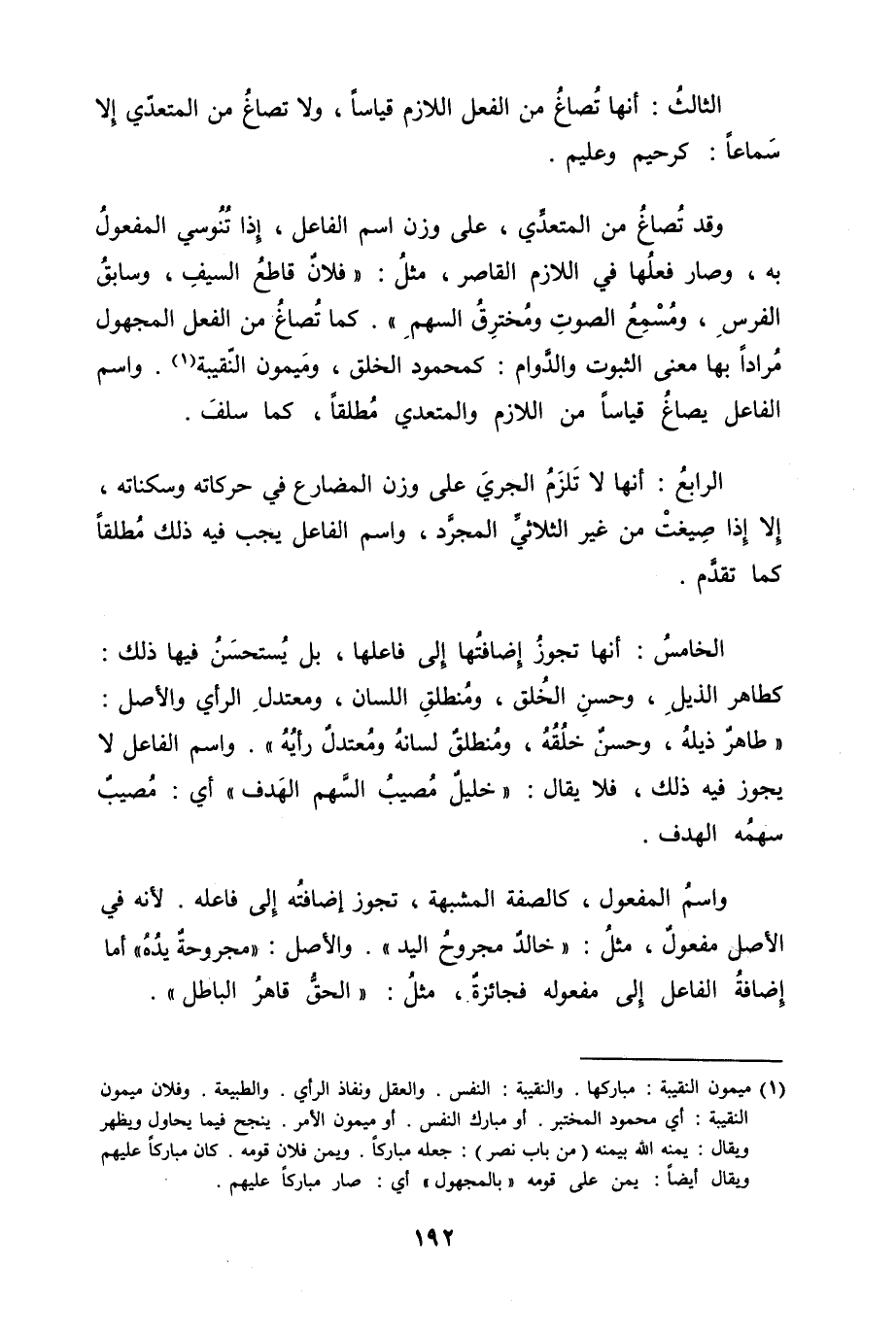 الثالثُ أنها تُصاغ من الفعل اللازم قياساً، ولا تصاغُ من المتعدّي إلا سَماعاً كرحيم وعليم.