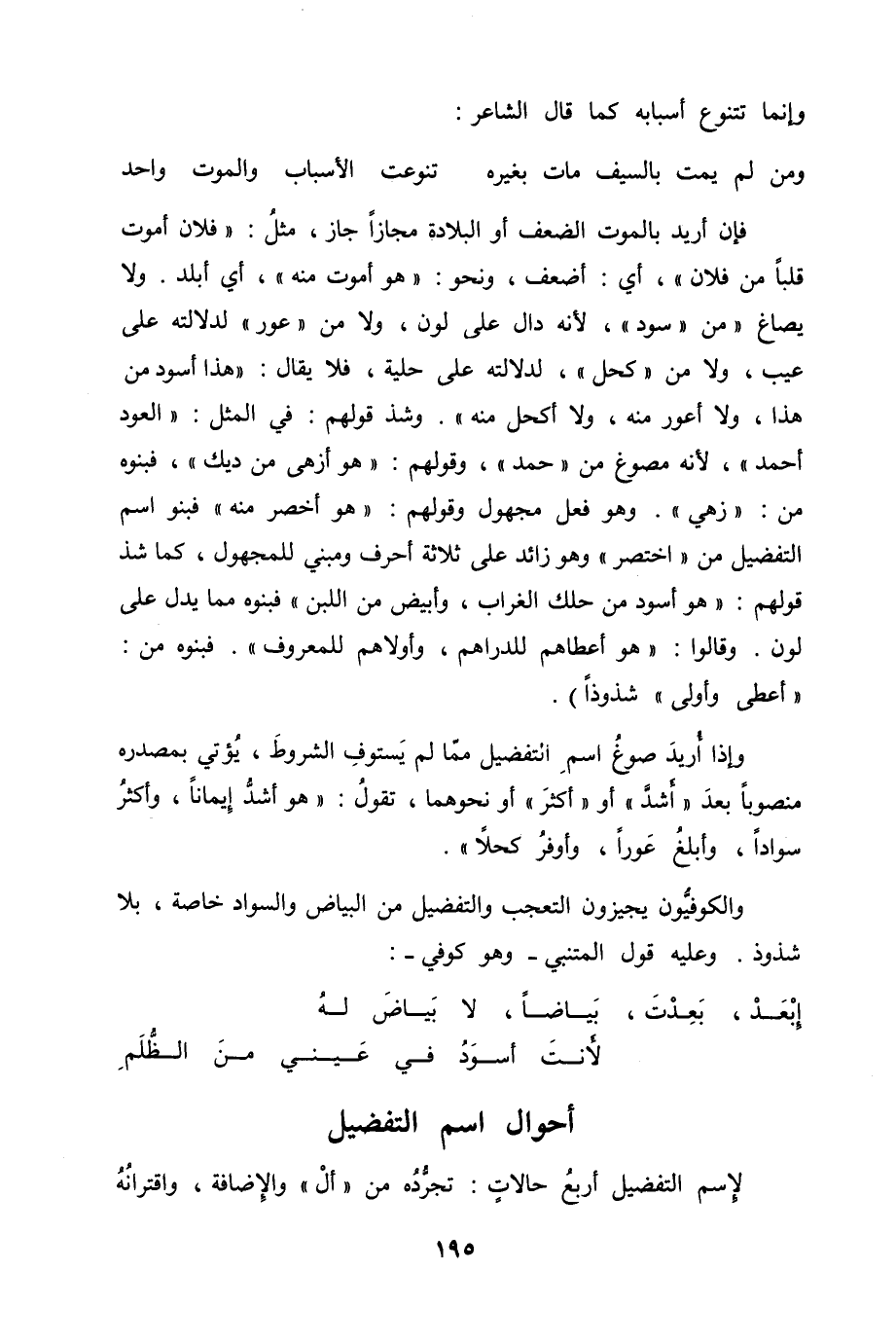 والكوفيُّون يجيزون التعجب والتفضيل من البياض والسود خاصة، بلا شذوذ. وعليه قول المتنبي - وهو كوفي -[من البسيط]