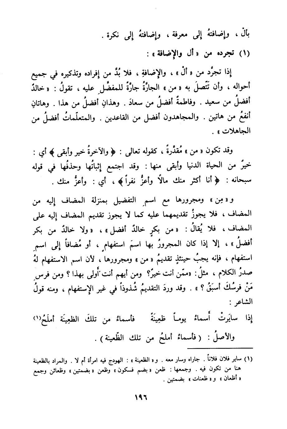 إذا تجرَّد من "ألْ"، والإضافةِ، فلا بُدَّ من إفراده وتذكيره في جميع أحواله، وأن تَتّصلَ به "من" الجارَّةُ جارَّةً للمفضَّلِ عليه، تقولُ "خالدٌ أفضلُ من سعيد. وفاطمةٌ أفضلُ من سعادَ. وهذانِ أفضلُ من هذا. وهاتانِ أنفعُ من هاتين. والمجاهدون أفضل من القاعدين. والمتعلّماتُ أفضلُ من الجاهلات".