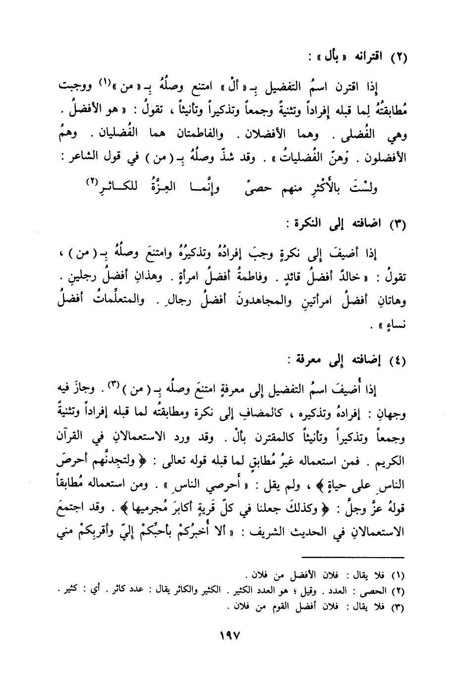 إذا اقترن اسمُ التفضيل بِـ "ألْ" امتنع وصلُهُ بِـ "من" ووجبت مُطابقتُهُ لِما قبله إفراداً وتثنيةً وجمعاً وتذكيراً وتأنيثاً، تقولُ "هو الأفضلُ، وهي الفُضلى. وهما الأفضلان. والفاطمتان هما الفُضليان. وهمُ الأفضلون. وهنّ الفُضلياتُ". وقد شذَّ وصلُهُ بِـ (من) في قول الشاعر [من السريع]