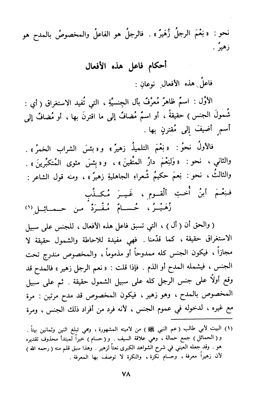 (والحق أن (أل) ، التي تسبق فاعل هذه الأفعال، للجنس على سبيل الاستغراق حقيقة، كما قدّمنا. فهي مفيدة للاحاطة والشمول حقيقة لا مجازاً، فيكون الجنس كله ممدوحاً أو مذموماً، والمخصوص مندرج تحت الجنس، فيشمله المدح أو الذم. فاذا قلت "نعم الرجل زهير" فالمدح قد وقع أولا على جنس الرجل كله على سبيل الشمول حقيقة. ثم على سبل المخصوص بالمدح، وهو زهير، فيكون المخصوص قد مدح مرتين مرة مع غيره، لدخوله في عموم الجنس، لأنه فرد من افراد ذلك الجنس، ومرة