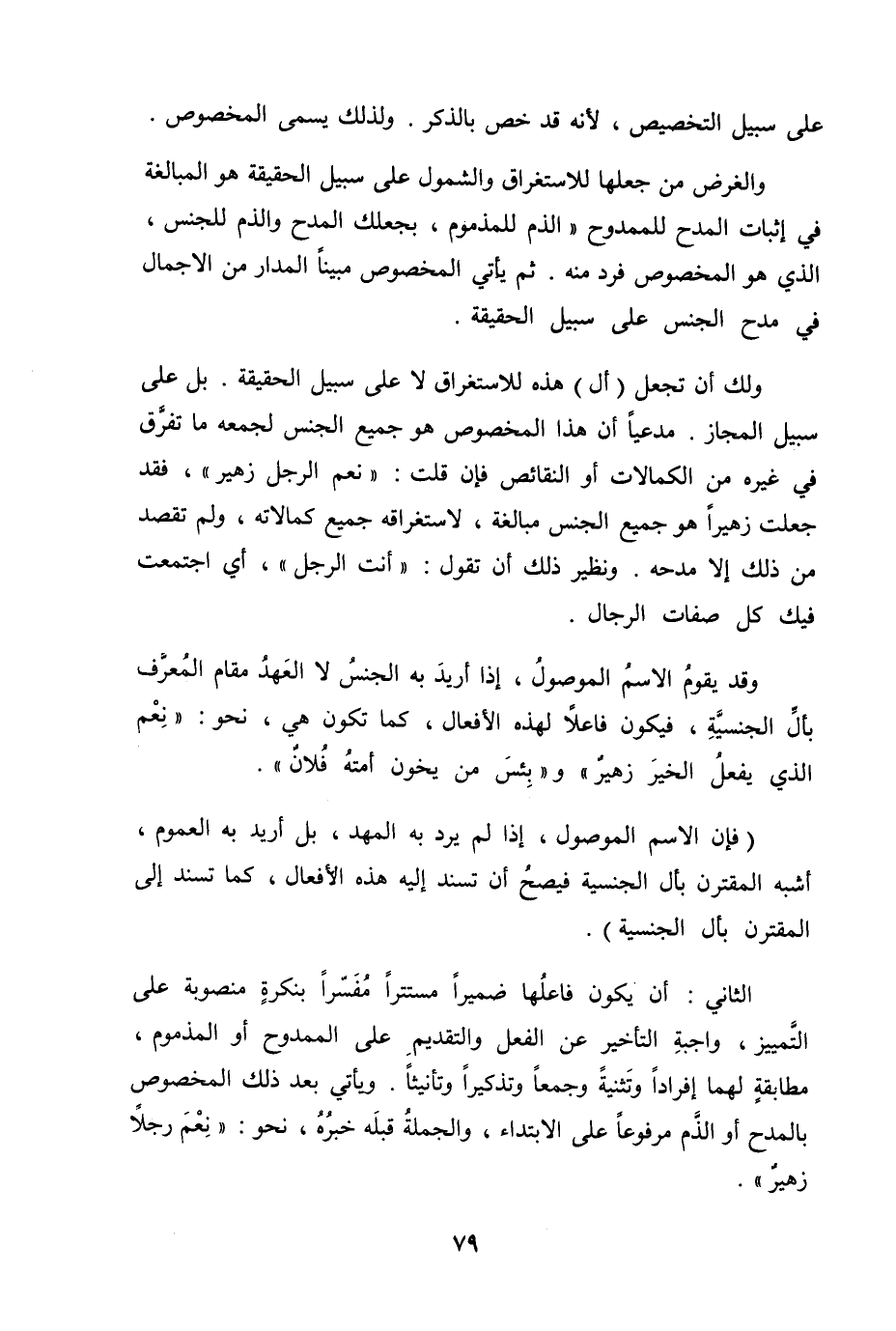 ولك أن تجعل (أل) هذه للاستغراق لا على سبيل الحقيقة. بل على سبيل المجاز. مدعياً أن هذا المخصوص هو جميع الجنس لجمعه ما تفرَّق في غيره من الكمالات أو النقائص فان قلت "نعم الرجل زهير"، فقد جعلت زهيراً هو جميع الجنس مبالغة، لاستغراقه جميع كمالاته، ولم تقصد من ذلك الا مدحه. ونظير ذلك أن تقول "أنت الرجل"، أي اجتمعت فيك كل صفات الرجال) .
