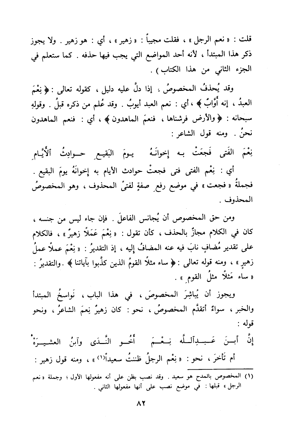 قلت "نعم الرجل"، فقلت مجيباً "زهير"، اي هو زهير. ولا يجوز ذكر هذا المبتدأ، لأنه احد المواضع التي يجب بها حذفه. كما ستعلم في الجزء الثاني من هذا الكتاب) .