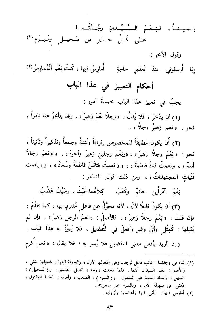 (1) أن يتأخرَ، فلا يُقالُ "رجلاً نِعْمَ زهيرٌ". وقد يتأخرُ عنه نادراً، نحو "نعم زهيرٌ رجلا".